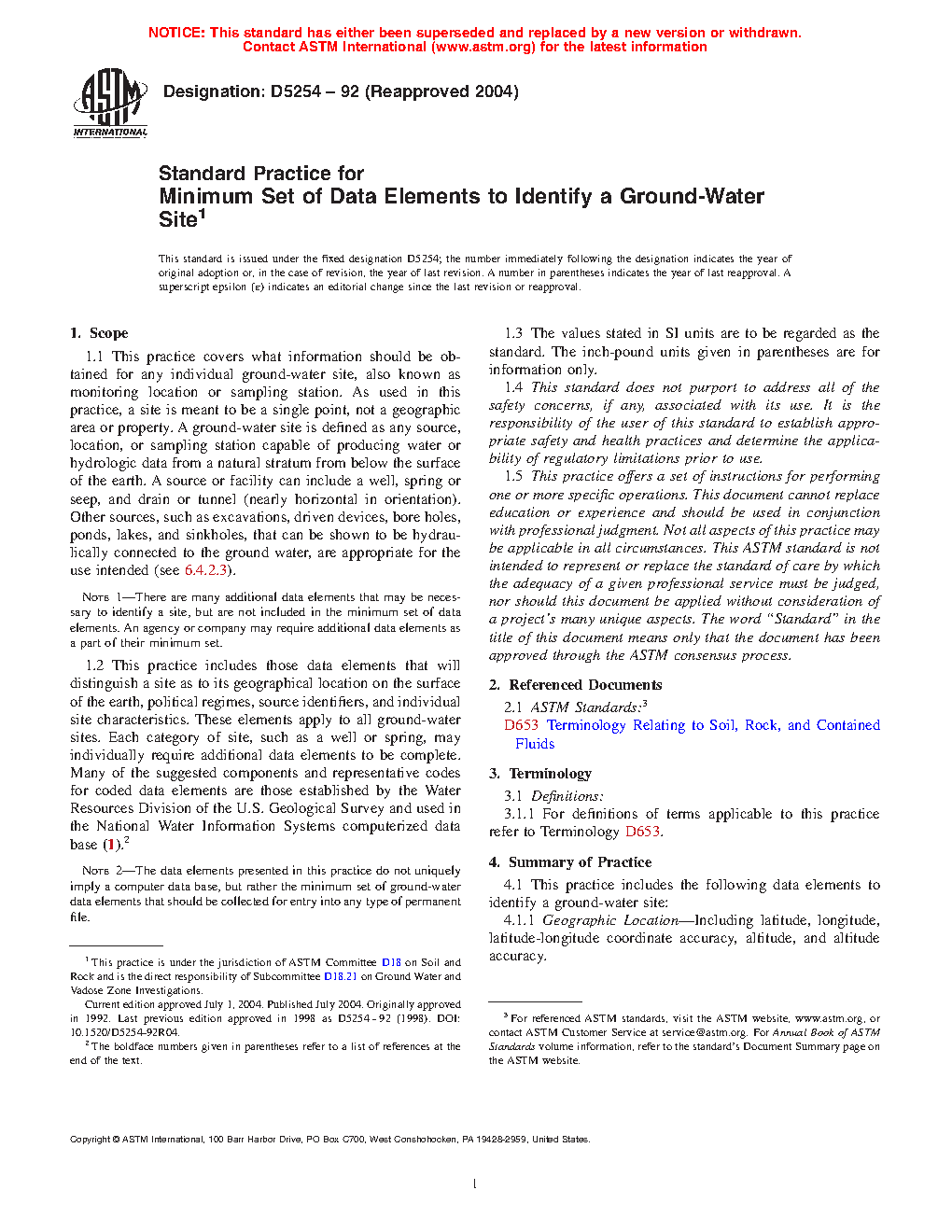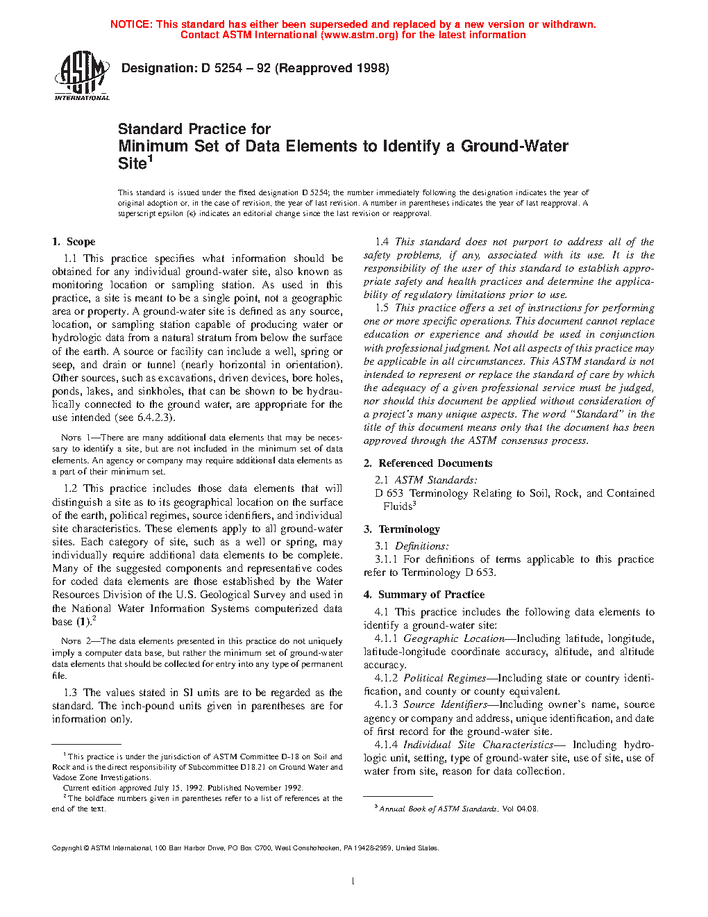 1.2 This practice includes those data elements that will distinguish a site as to its geographical location on the surface of the earth, political regimes, source identifiers, and individual site characteristics. These elements apply to all ground-water sites. Each category of site, such as a well or spring, may individually require additional data elements to be complete. Many of the suggested components and representative codes for coded data elements are those established by the Water Resources Division of the U.S. Geological Survey and used in the National Water Information Systems computerized data base