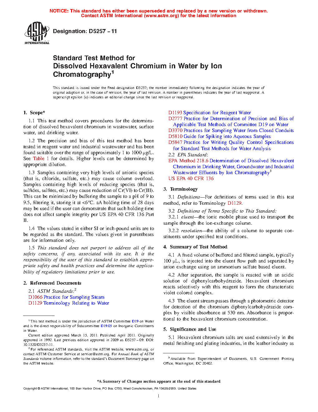 1.1 This test method covers procedures for the determination of dissolved hexavalent chromium in waste water, surface water, and drinking water.