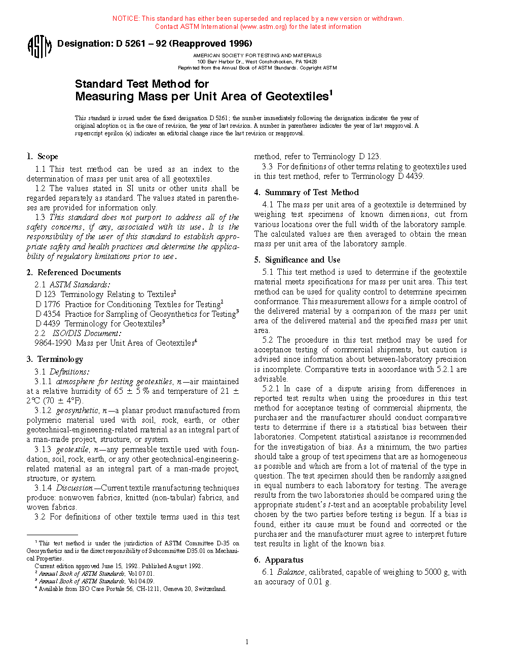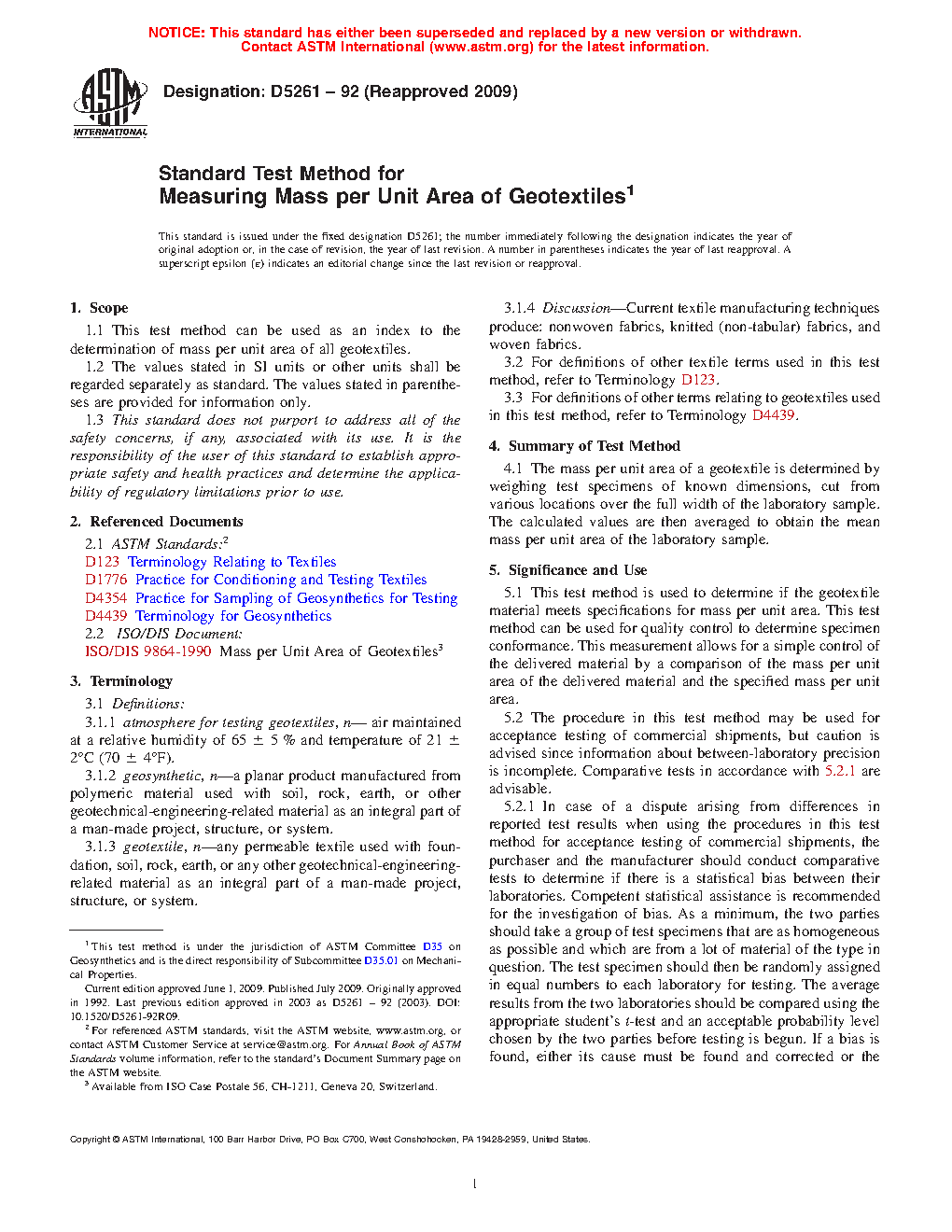 This test method is used to determine if the geotextile material meets specifications for mass per unit area. This test method can be used for quality control to determine specimen conformance. This measurement allows for a simple control of the delivered material by a comparison of the mass per unit area of the delivered material and the specified mass per unit area.