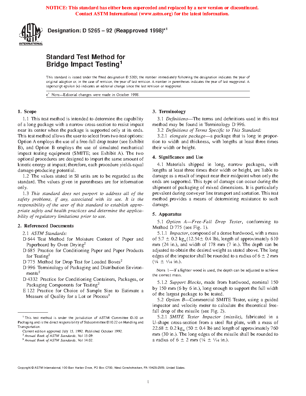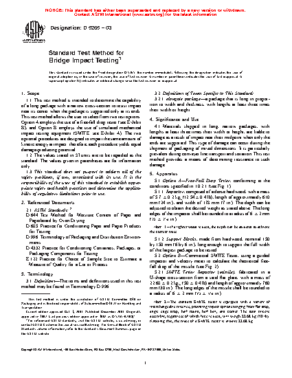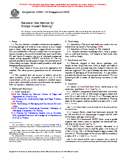 1.1 This test method is intended to determine the capability of a long package with a narrow cross-section to resist impact near its center when the package is supported only at its ends. This test method allows the user to select from two test options: Option A employs the use of a free-fall drop tester (see Exhibit B), and Option B employs the use of simulated mechanical impact testing equipment (S.M.I.T.E.; see Exhibit A). The two optional procedures are designed to impart the same amount of kinetic energy at impact; therefore, each procedure yields equal damage-producing potential.