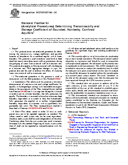 1.1 This practice covers an analytical procedure for determining the transmissivity, storage coefficient, and possible location of boundaries for a confined aquifer with a linear boundary. This practice is used to analyze water-level or head data from one or more observation wells or piezometers during the pumping of water from a control well at a constant rate. This practice also applies to flowing artesian wells discharging at a constant rate. With appropriate changes in sign, this practice also can be used to analyze the effects of injecting water into a control well at a constant rate.