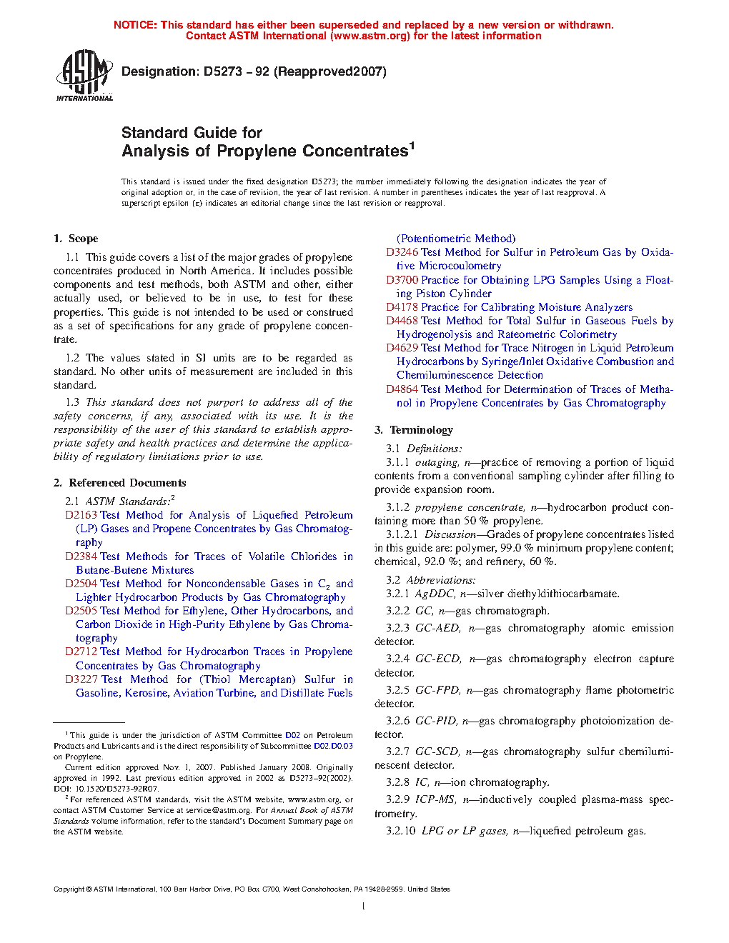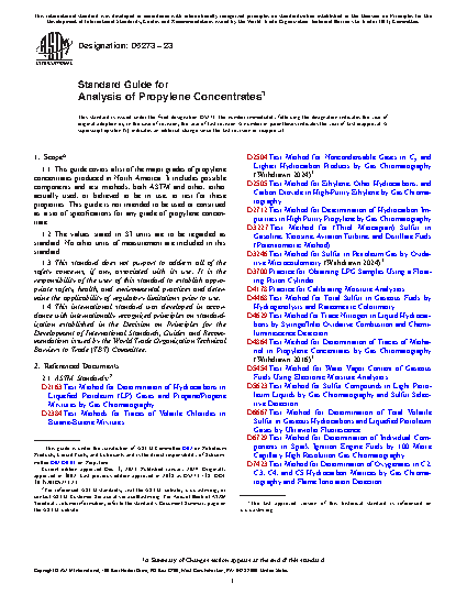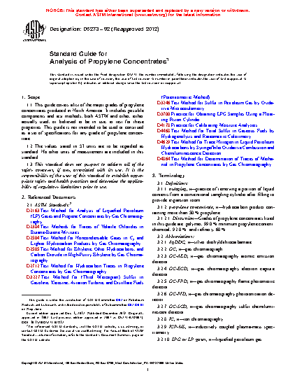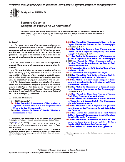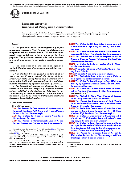 1.1 This guide lists the major grades of propylene concentrates produced in North America. It includes possible components and test methods, both ASTM and other, either actually used, or believed to be in use, to test for these properties. This guide is not intended to be used or construed as a set of specifications for any grade of propylene concentrate.