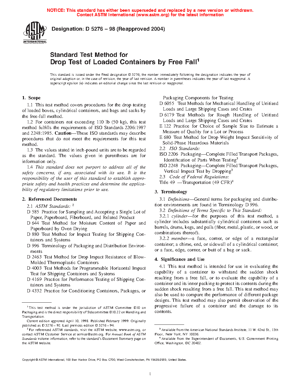 1.2 For containers not exceeding 110 lb (50 kg), this test method fulfills the requirements of ISO Standards 2206:1987 and 2248:1985. These ISO standards may describe procedures that do not meet the requirements for this test method.