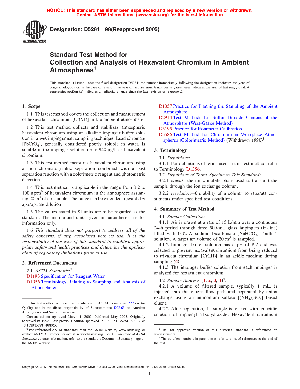 1.1 This test method covers the collection and measurement of hexavalent chromium [CR(VI)] in ambient, workplace, or indoor atmospheres.