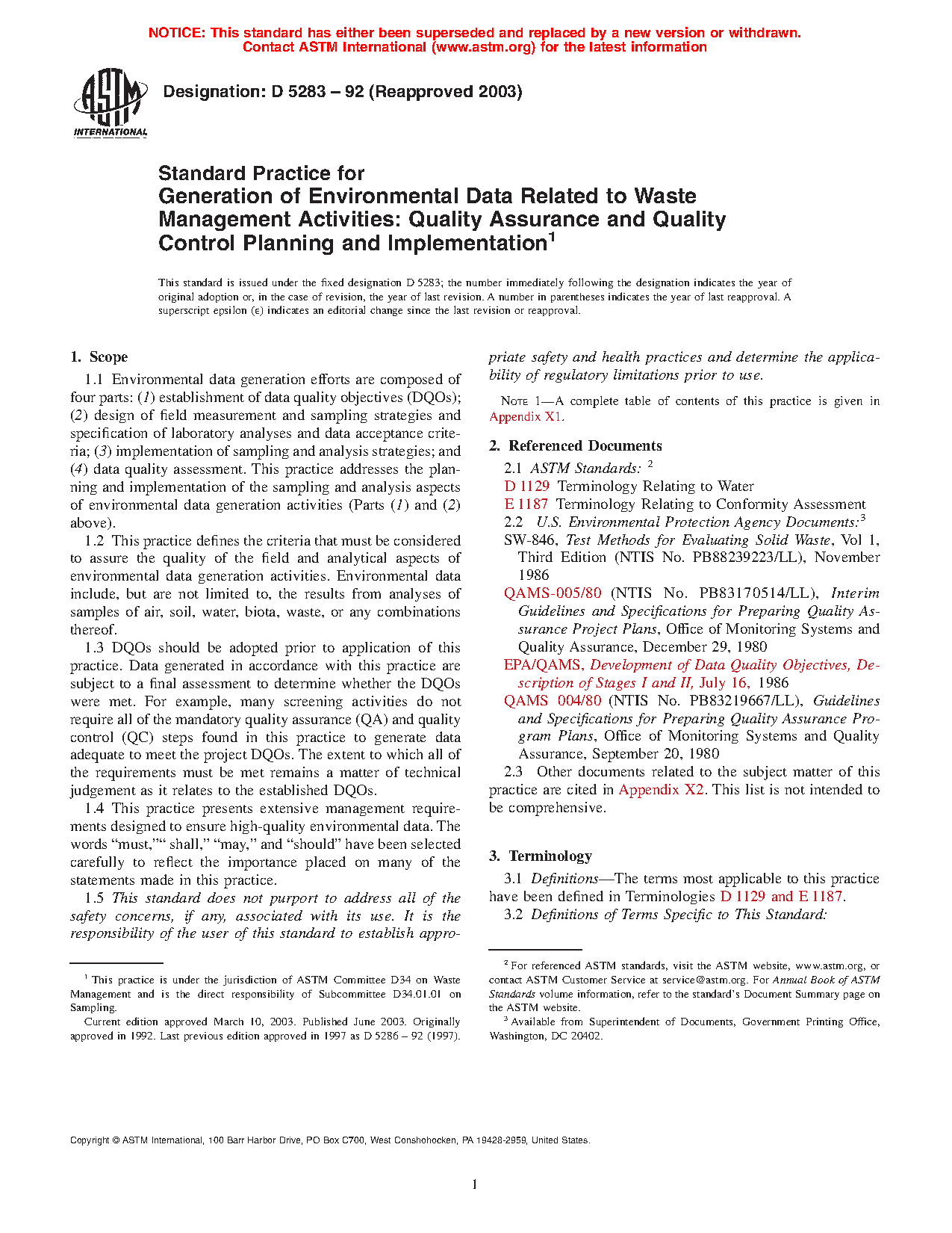 This practice defines the criteria for field and laboratory organizations generating environmental data and identifies some other activities that may be required based on the DQOs.