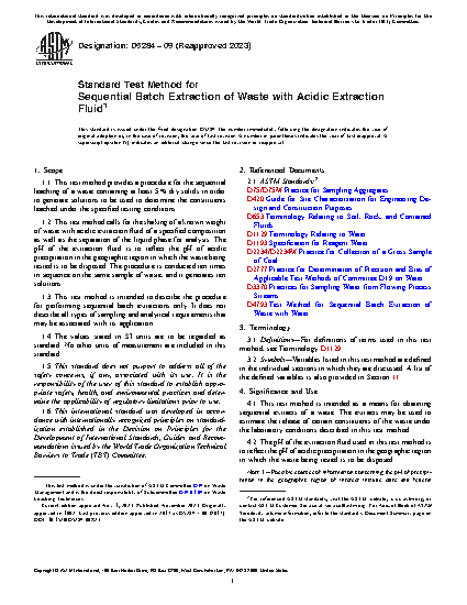 1.1 This test method provides a procedure for the sequential leaching of a waste containing at least 5% dry solids in order to generate solutions to be used to determine the constituents leached under the specified testing conditions.