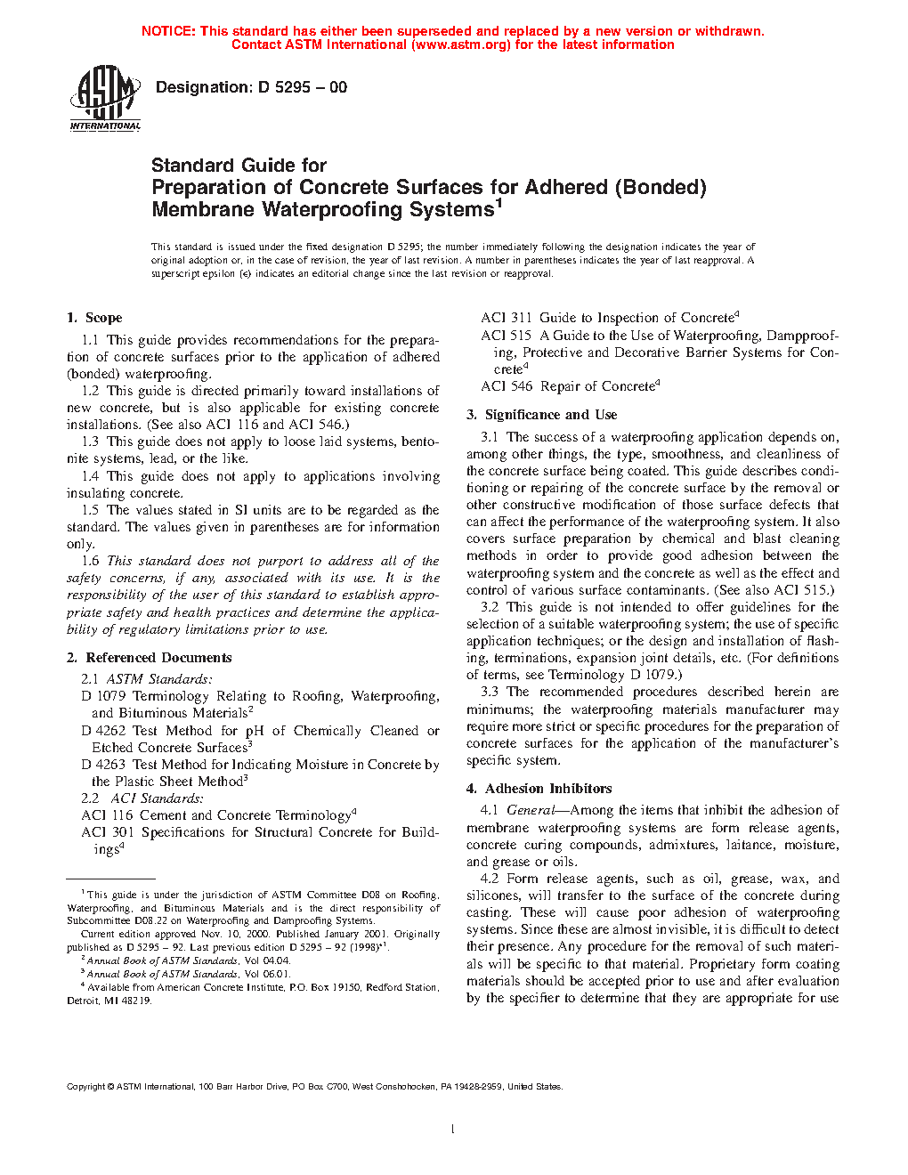 1.1 This guide provides recommendations for the preparation of concrete surfaces prior to the application of adhered (bonded) waterproofing.