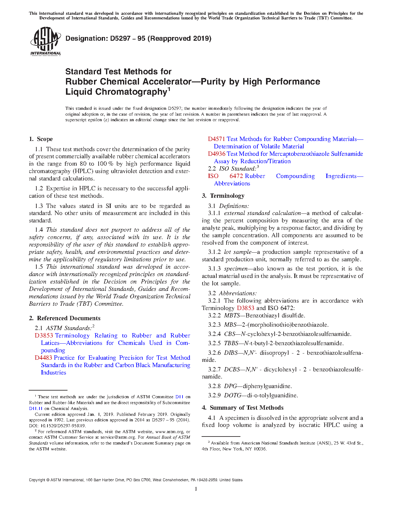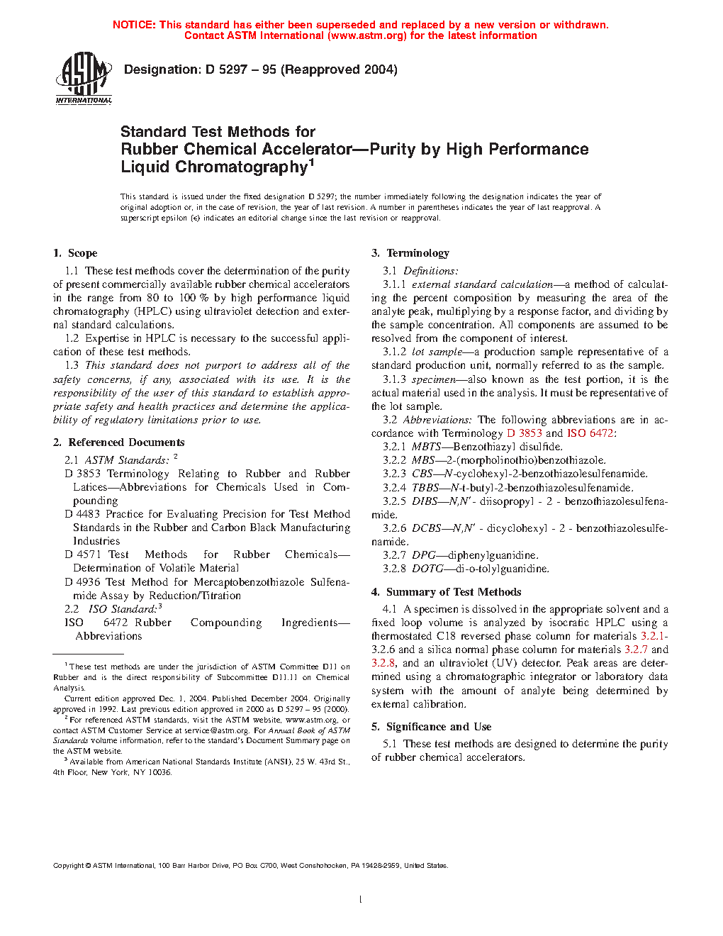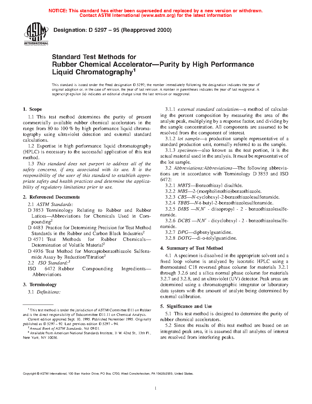 1.1 These test methods cover the determination of the purity of present commercially available rubber chemical accelerators in the range from 80 % to 100 % by high performance liquid chromatography (HPLC) using ultraviolet detection and external standard calculations.