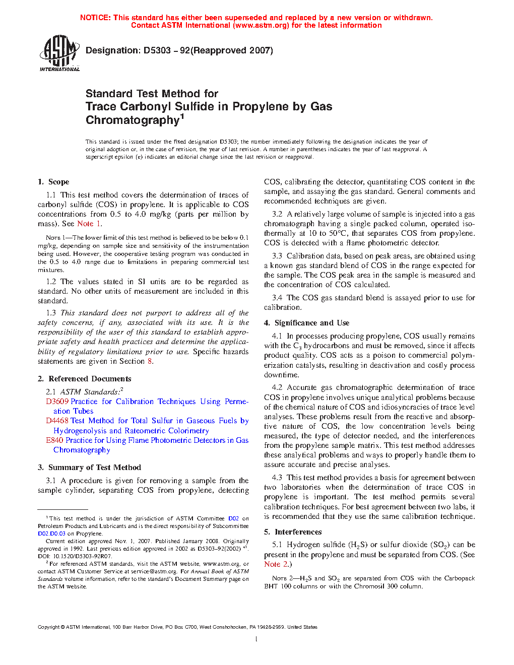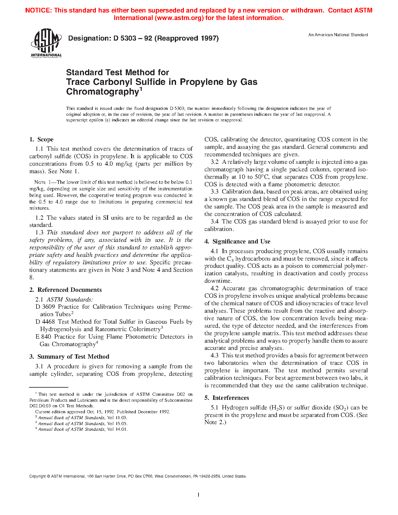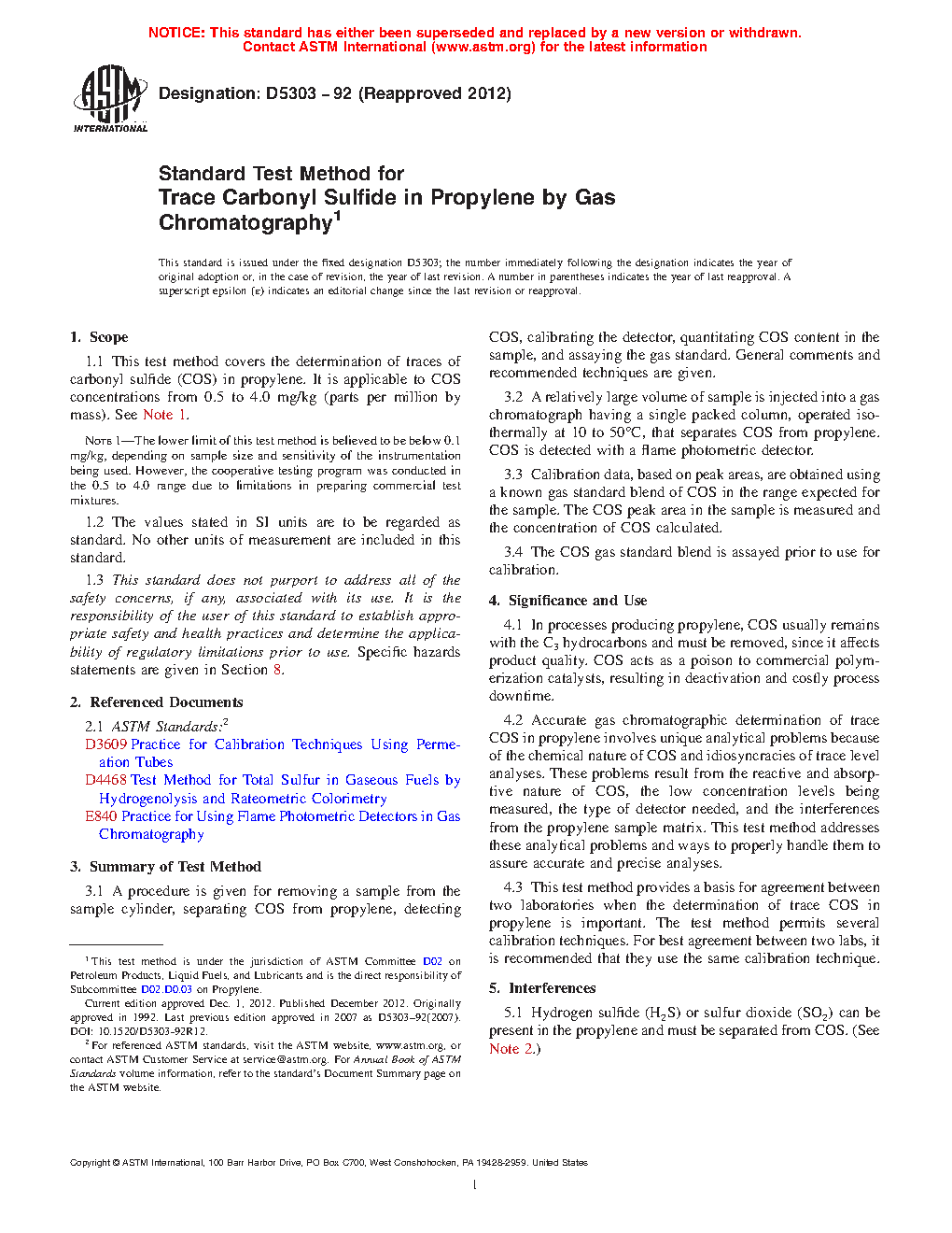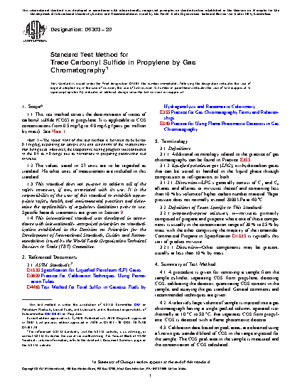 5.3 This test method provides a basis for agreement between two laboratories when the determination of trace COS in propylene is important. The test method permits several calibration techniques. For best agreement between two labs, it is recommended that they use the same calibration technique.