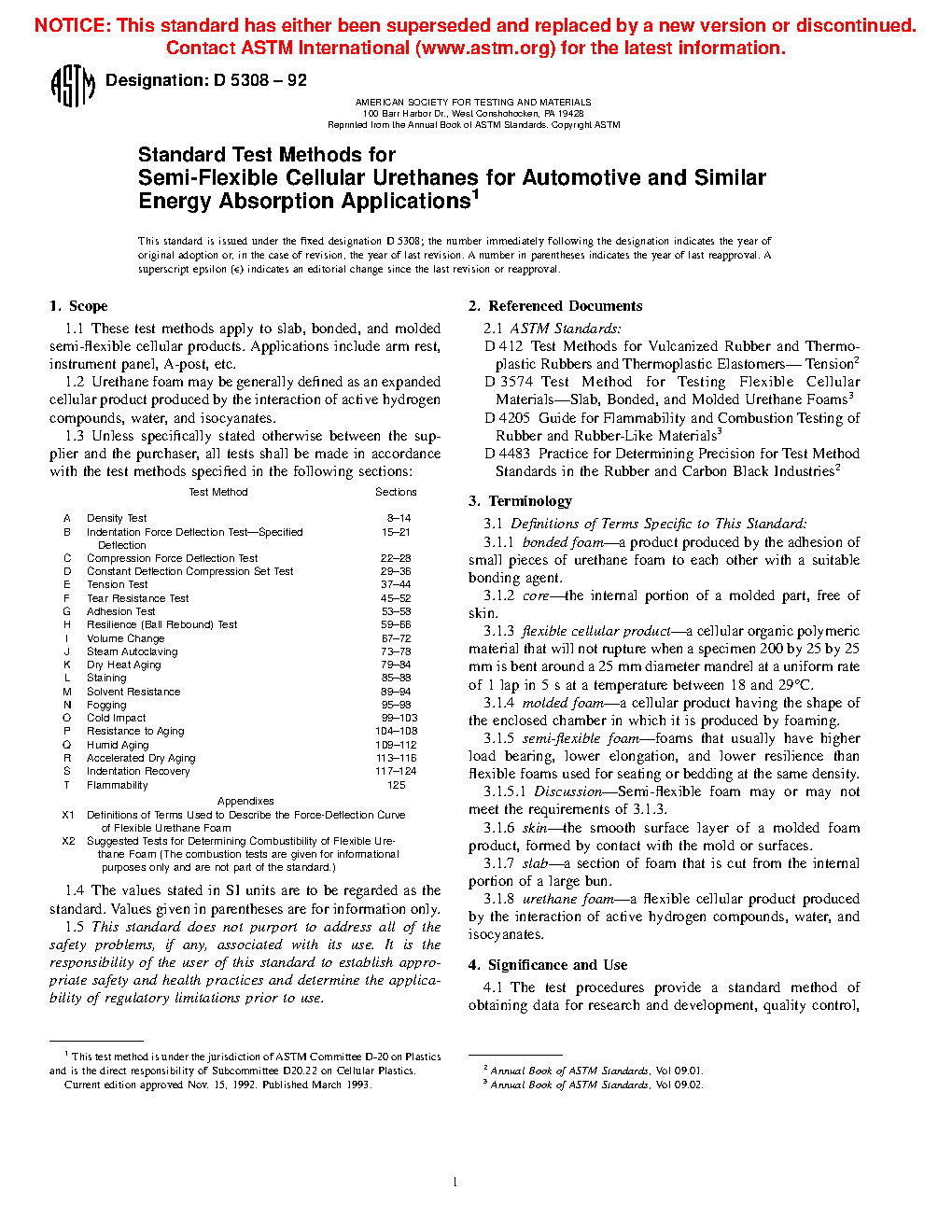 Methods of Testing Semi-Flexible Cellular Urethanes for Automotive and Similar Energy Absorption Applications (Withdrawn 1998)