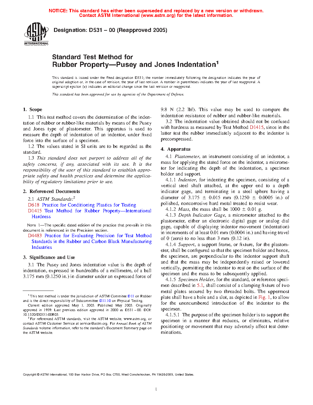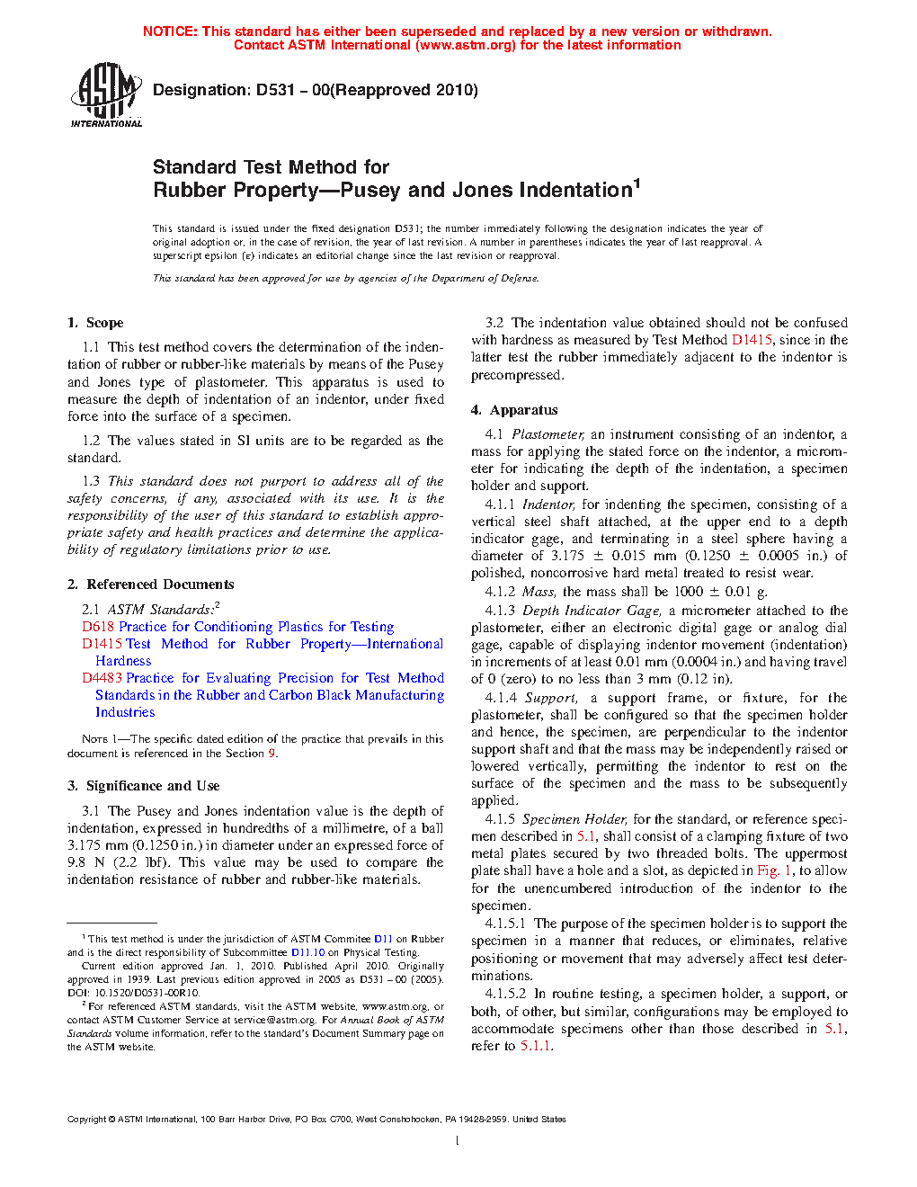 1.1 This test method covers the determination of the indentation of rubber or rubber-like materials by means of the Pusey and Jones type of plastometer. This apparatus is used to measure the depth of indentation of an indentor, under fixed force into the surface of a specimen.