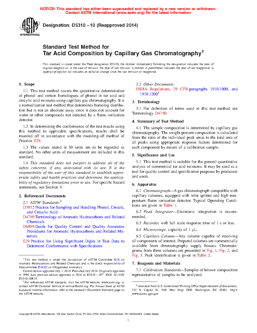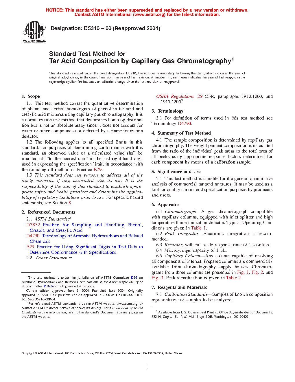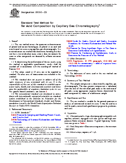 1.1 This test method covers the quantitative determination of phenol and certain homologues of phenol in tar acid and cresylic acid mixtures using capillary gas chromatography. It is a normalization test method that determines homolog distribution but is not an absolute assay since it does not account for water or other compounds not detected by a flame ionization detector.