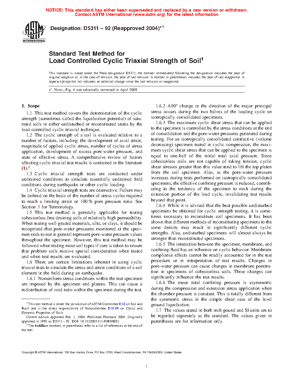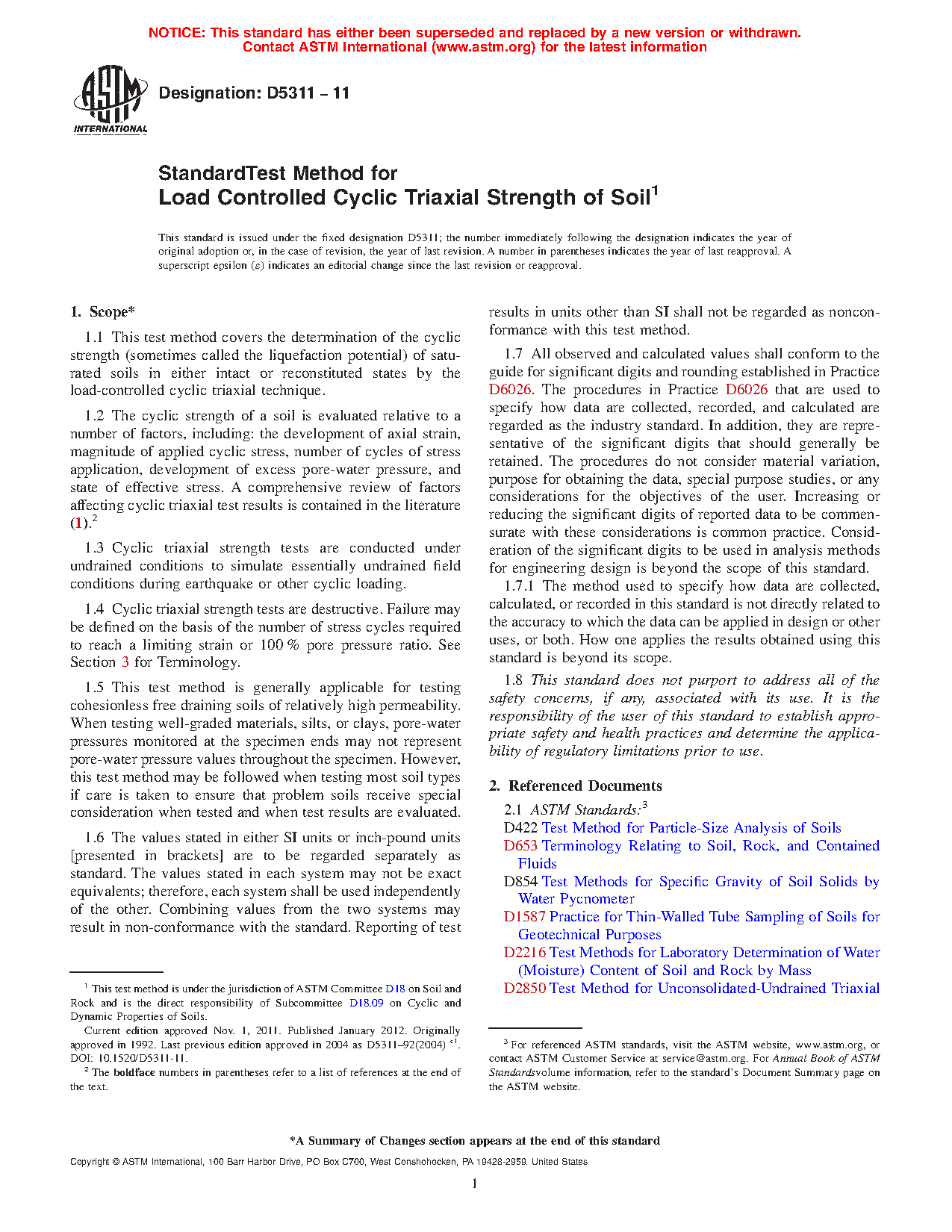 1.4 Cyclic triaxial strength tests are destructive. Failure may be defined on the basis of the number of stress cycles required to reach a limiting strain or 100 % pore pressure ratio. See Section for Terminology.
