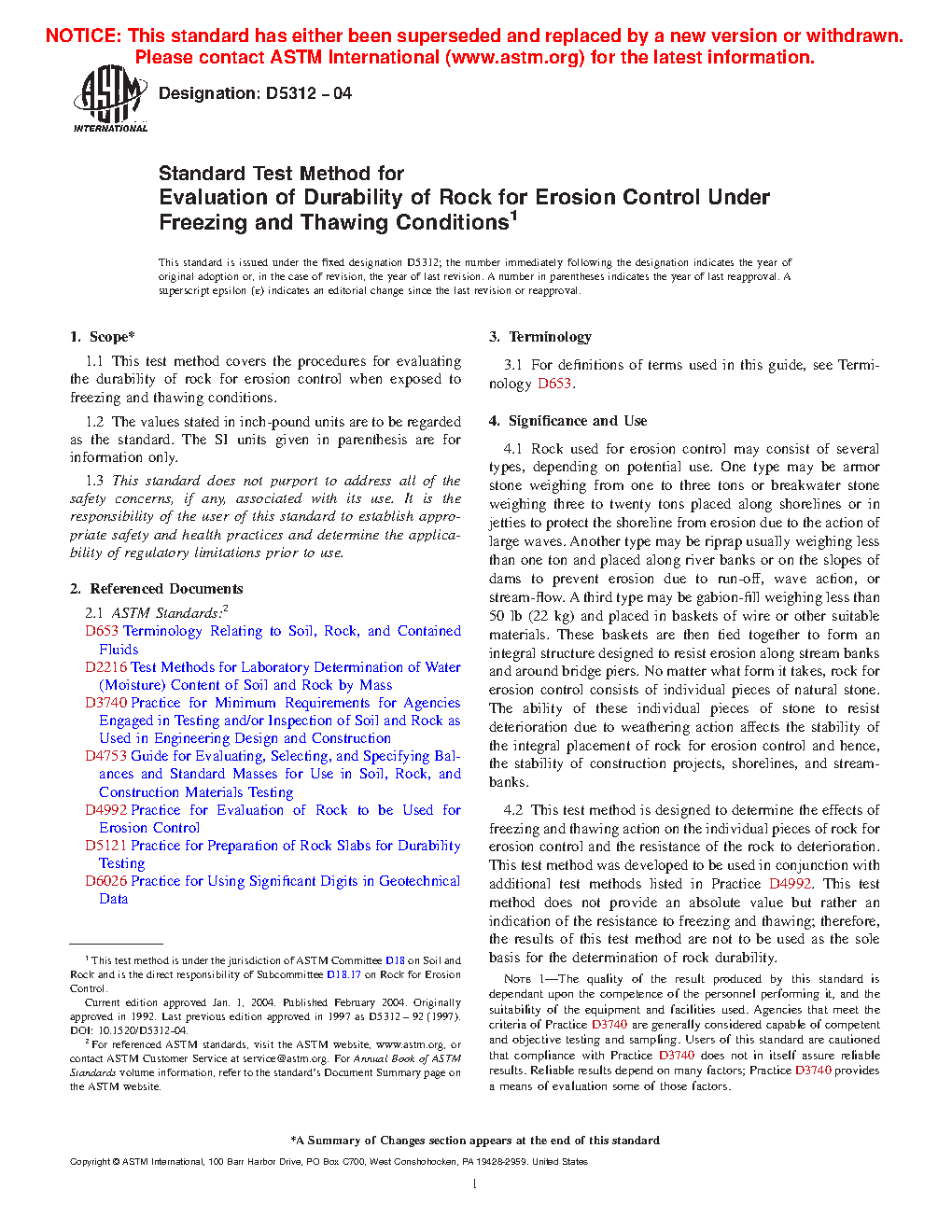 5.1 Rock for erosion control consists of individual pieces of natural stone. The ability of these individual pieces of stone to resist deterioration due to weathering action affects the stability of the integral placement of rock for erosion control and hence, the stability of construction projects, structures, shorelines, and stream banks.