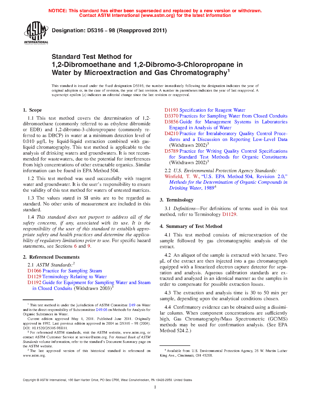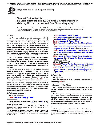1.1 This test method covers the determination of 1,2-dibromoethane (commonly referred to as ethylene dibromide or EDB) and 1,2-dibromo-3-chloropropane (commonly referred to as DBCP) in water at a minimum detection level of 0.010 μg/L by liquid-liquid extraction combined with gas-liquid chromatography. This test method is applicable to the analysis of drinking waters and groundwaters. It is not recommended for wastewaters, due to the potential for interferences from high concentrations of other extractable organics. Similar information can be found in EPA Method 504.