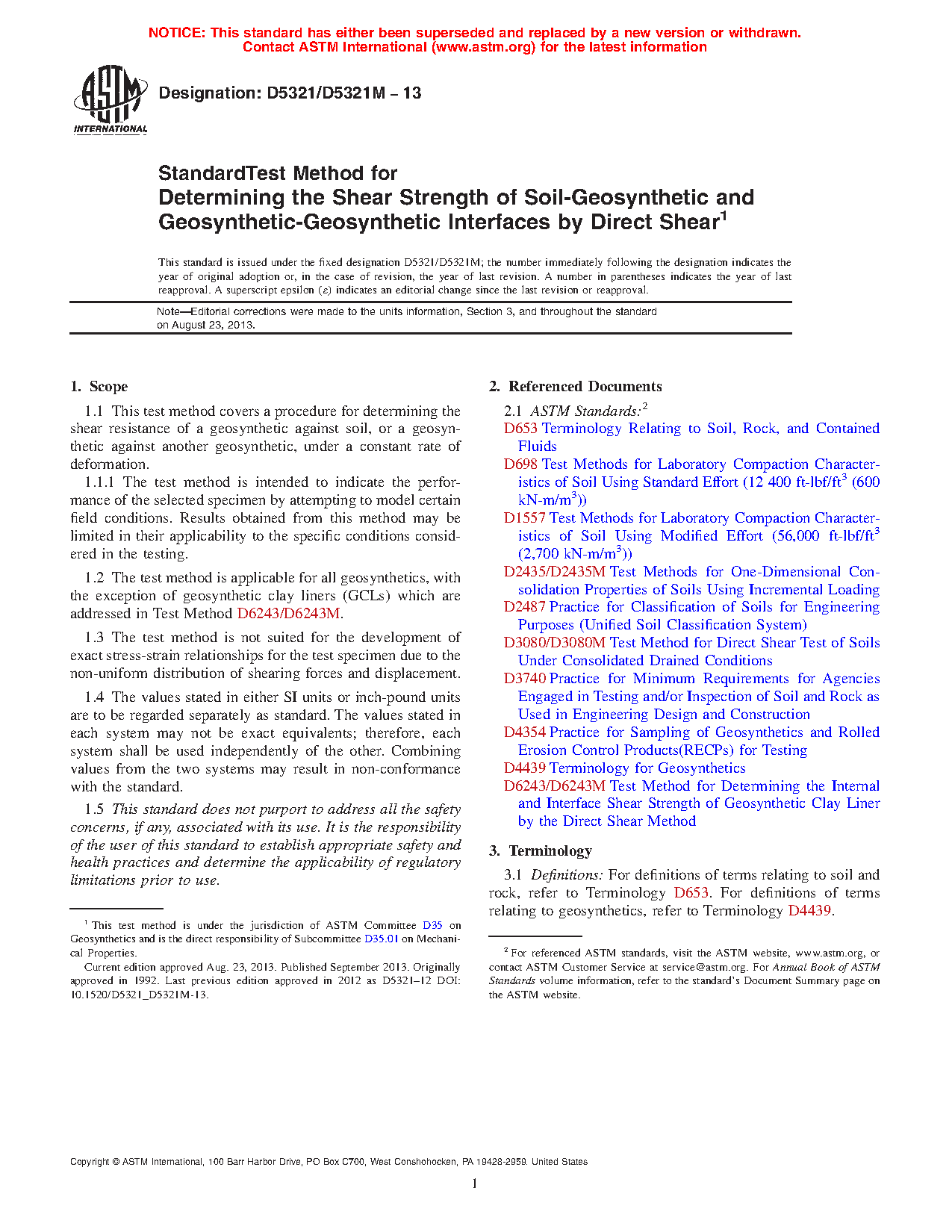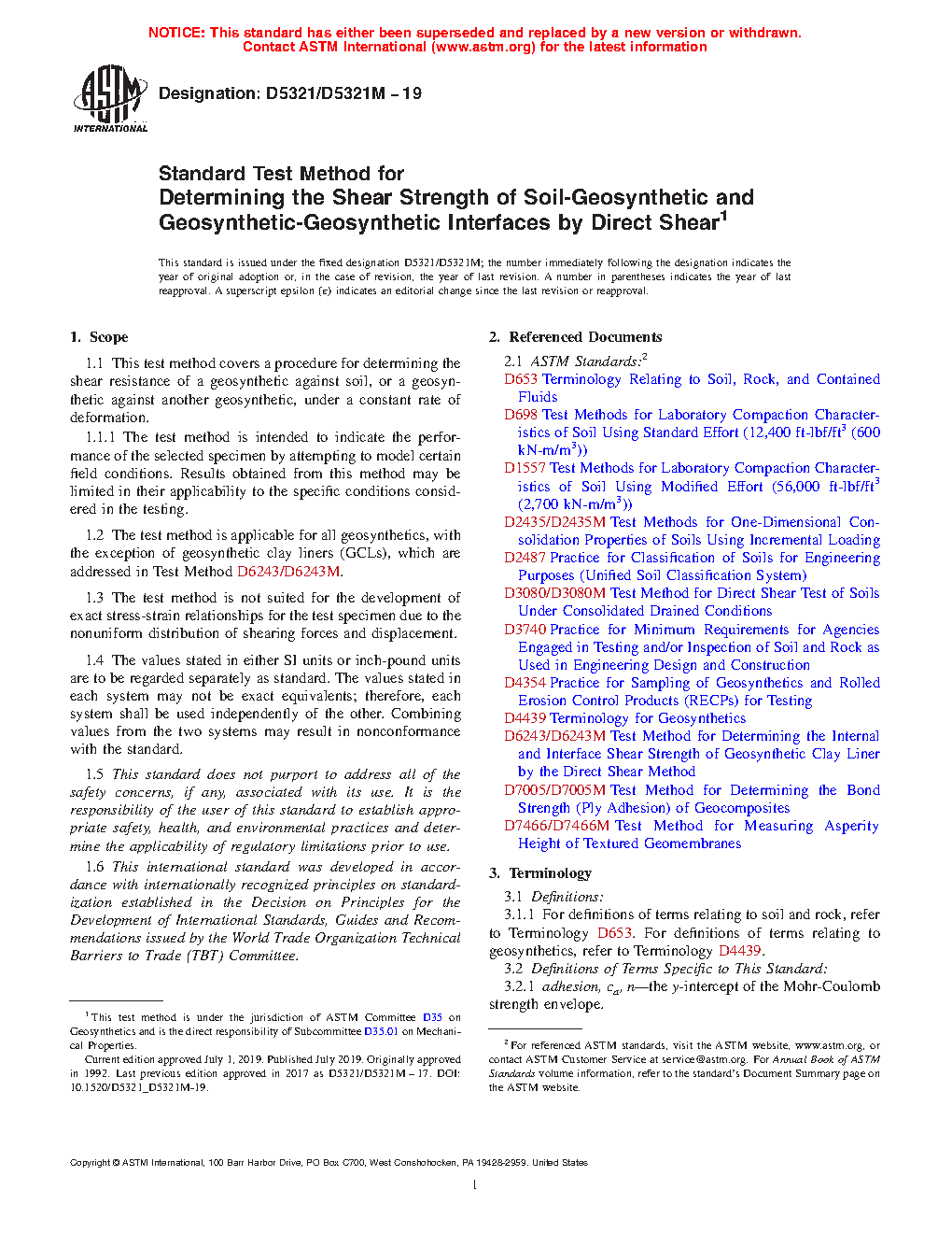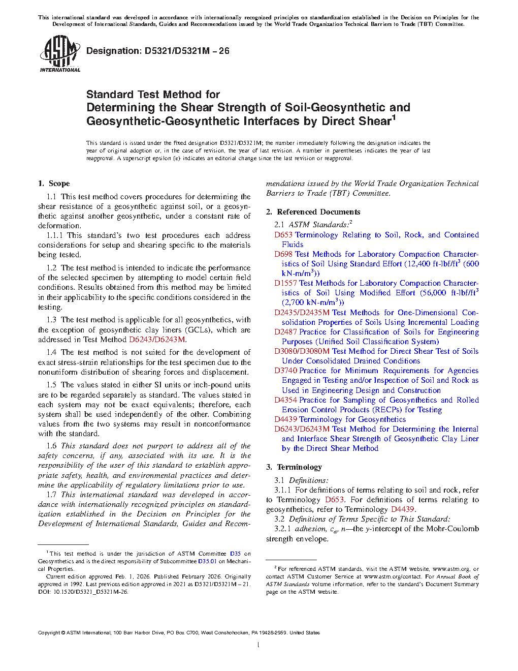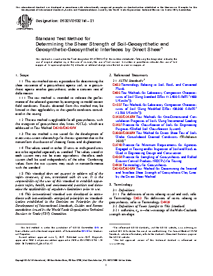1.1 This test method covers a procedure for determining the shear resistance of a geosynthetic against soil, or a geosynthetic against another geosynthetic, under a constant rate of deformation.