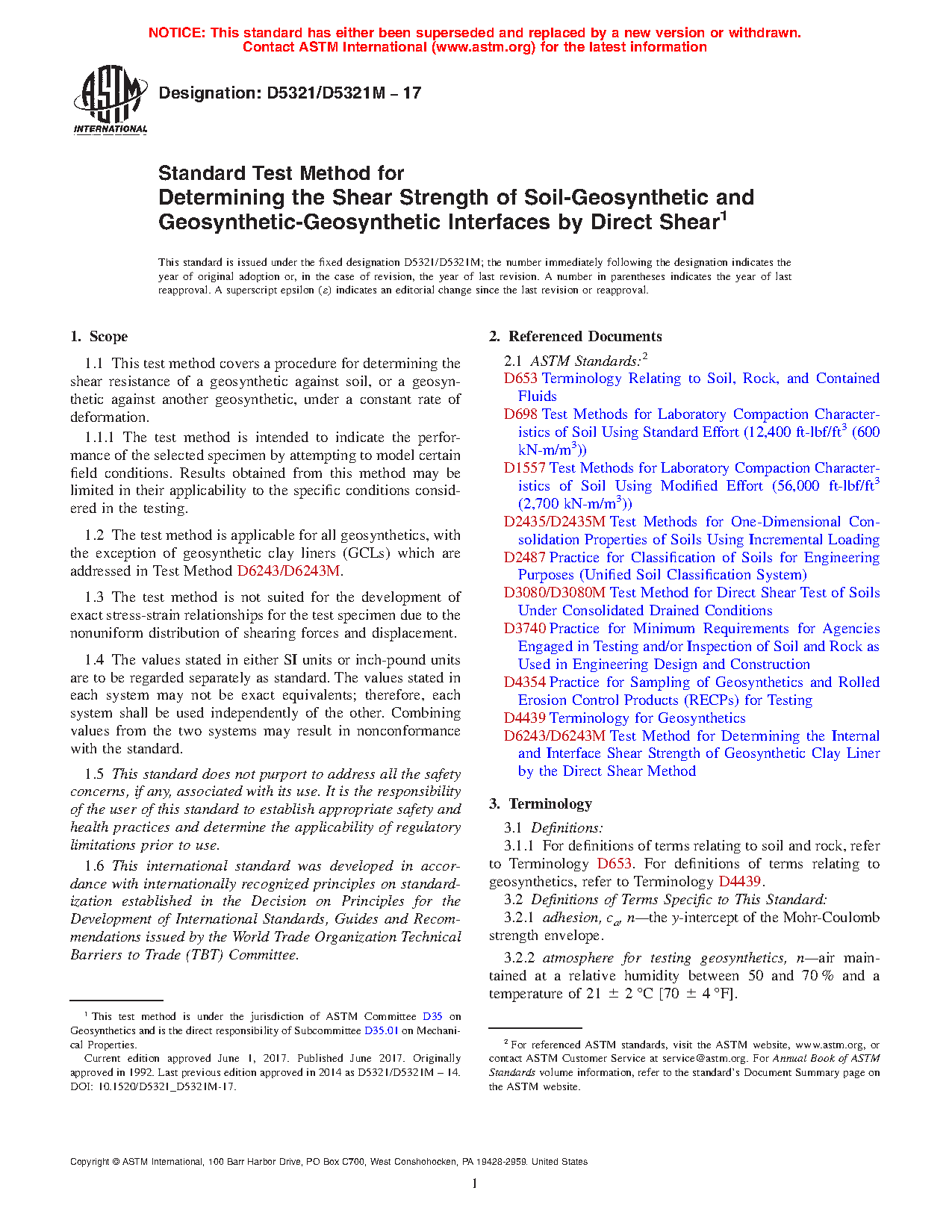 5.1 The procedure described in this test method for determination of the shear resistance of the soil and geosynthetic or geosynthetic and geosynthetic interface is intended as a performance test to provide the user with a set of design values for the test conditions examined. The test specimens and conditions, including normal stresses, are generally selected by the user.