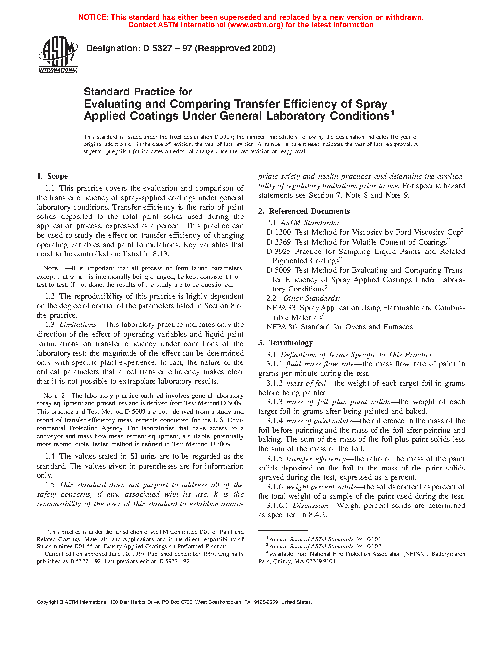 1.1 This practice covers the evaluation and comparison of the transfer efficiency of spray-applied coatings under general laboratory conditions. Transfer efficiency is the ratio of paint solids deposited to the total paint solids used during the application process, expressed as a percent. This practice can be used to study the effect on transfer efficiency of changing operating variables and paint formulations. Key variables that need to be controlled are listed in 8.13.