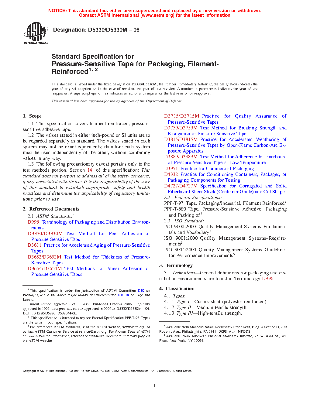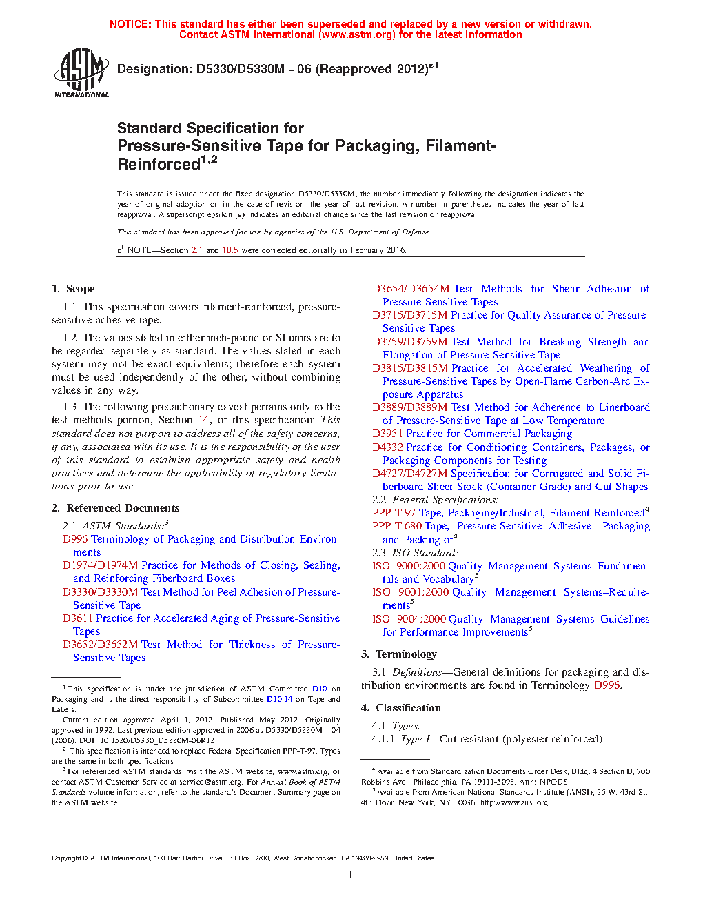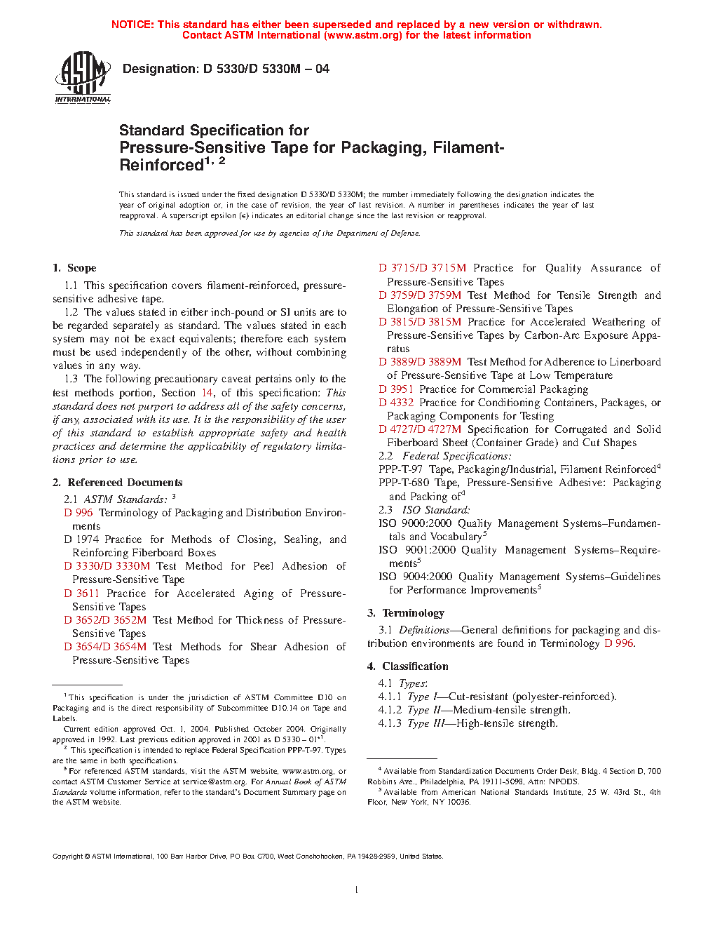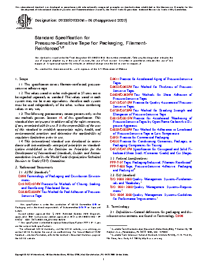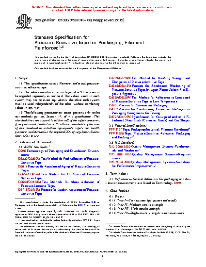 Standard Specification for Pressure-Sensitive Tape for Packaging, Filament- Reinforced