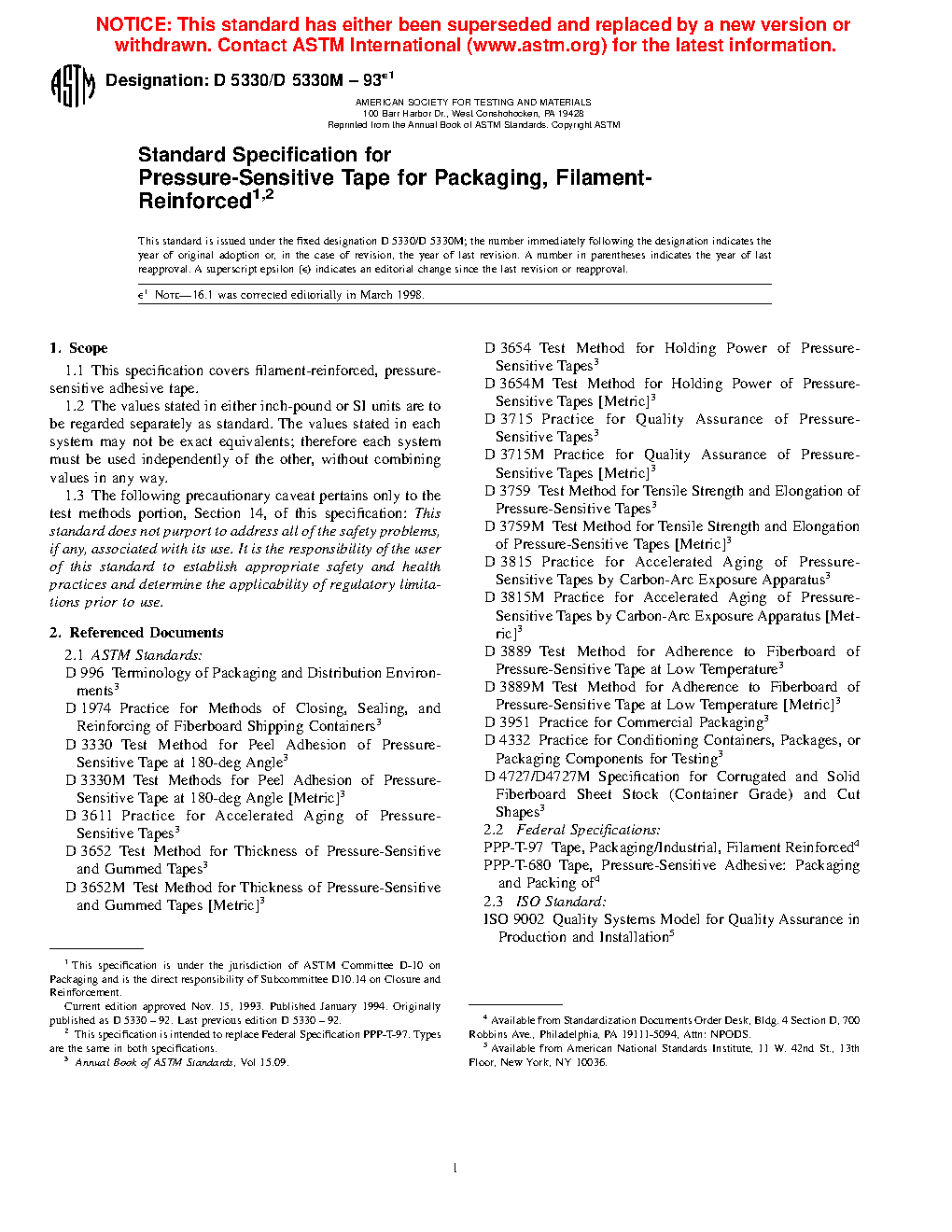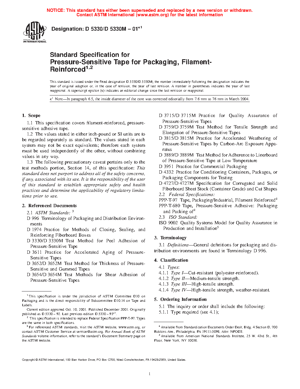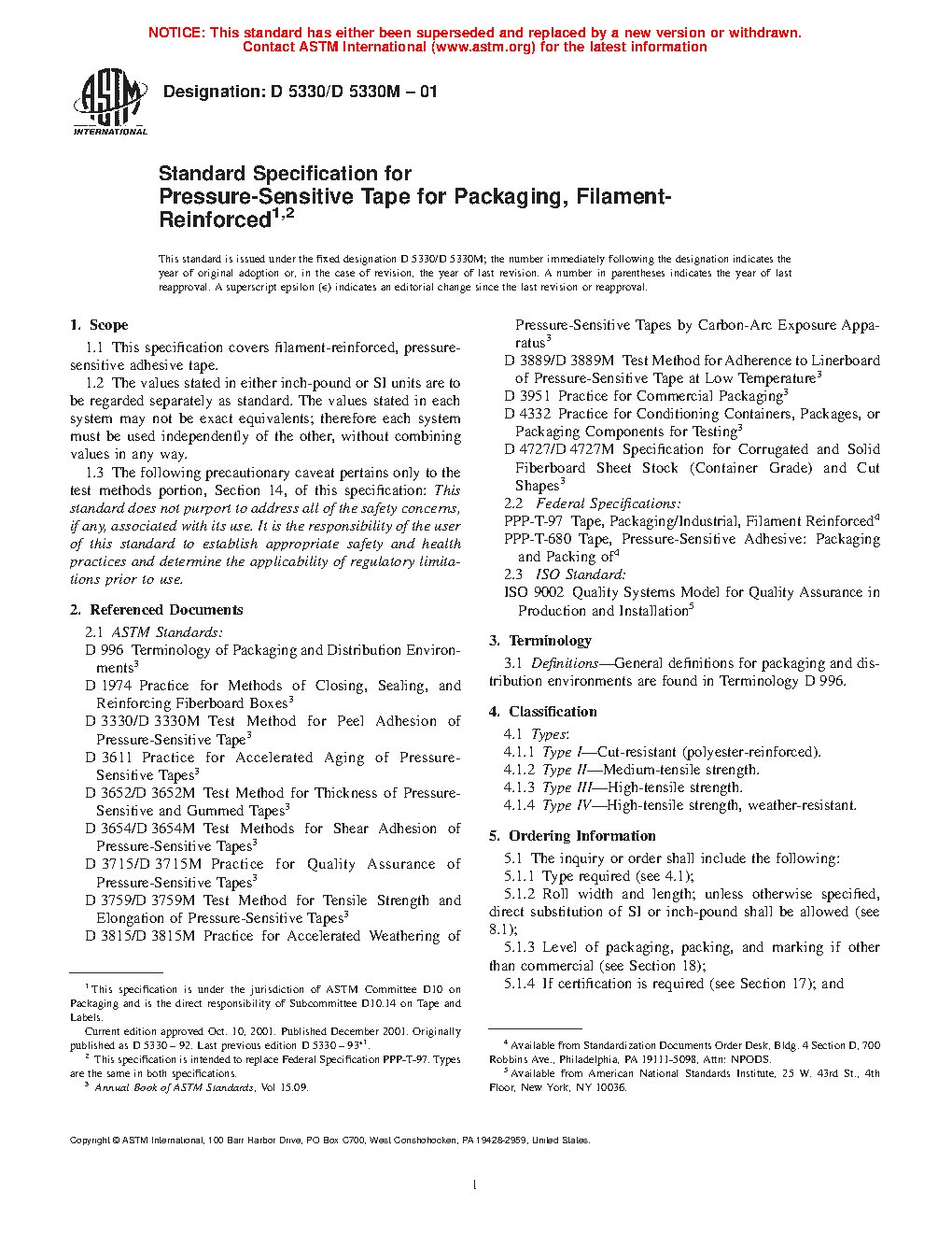 Standard Specification for Pressure-Sensitive Tape for Packaging, Filament- Reinforced