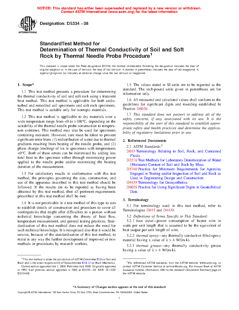 1.2 This test method is applicable to dry, unsaturated or saturated materials that can sustain a hole for the sensor. It is valid over temperatures ranging from <0 to >100°C, depending on the suitability of the thermal needle probe construction to temperature extremes. However, care must be taken to prevent significant error from: (1) redistribution of water due to thermal gradients resulting from heating of the needle probe; (2) redistribution of water due to hydraulic gradients (gravity drainage for high degrees of saturation or surface evaporation); (3) phase change of water in specimens with temperatures near 0°C or 100°C.