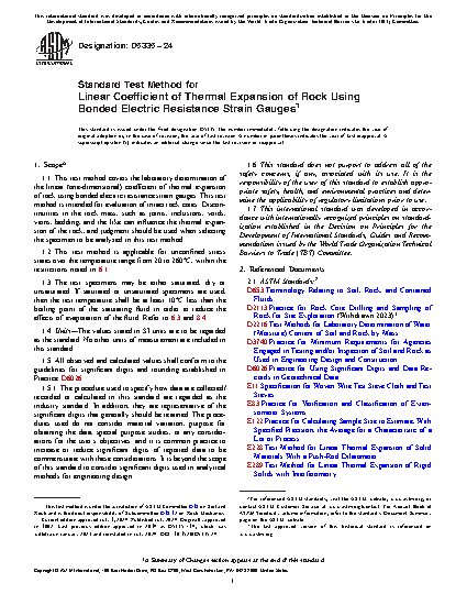 1.1 This test method covers the laboratory determination of the linear (one-dimensional) coefficient of thermal expansion of rock using bonded electric resistance strain gauges.