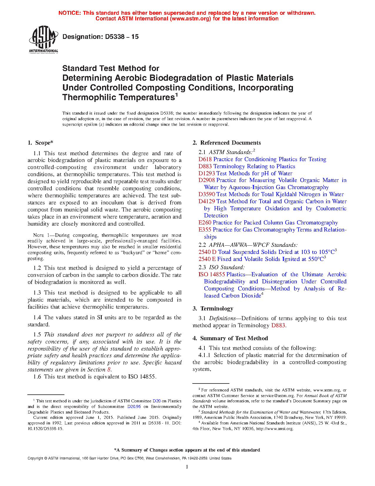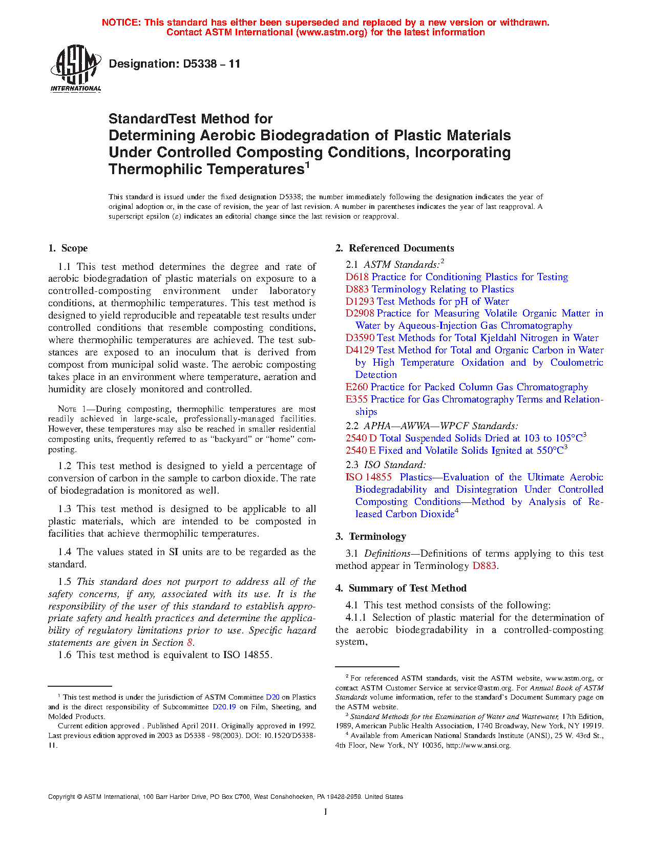 1.1 This test method determines the degree and rate of aerobic biodegradation of plastic materials on exposure to a controlled-composting environment under laboratory conditions. This test method is designed to yield reproducible and repeatable test results under controlled conditions that resemble composting conditions. The test substances are exposed to an inoculum that is derived from compost from municipal solid waste. The aerobic composting takes place in an environment where temperature, aeration and humidity are closely monitored and controlled.