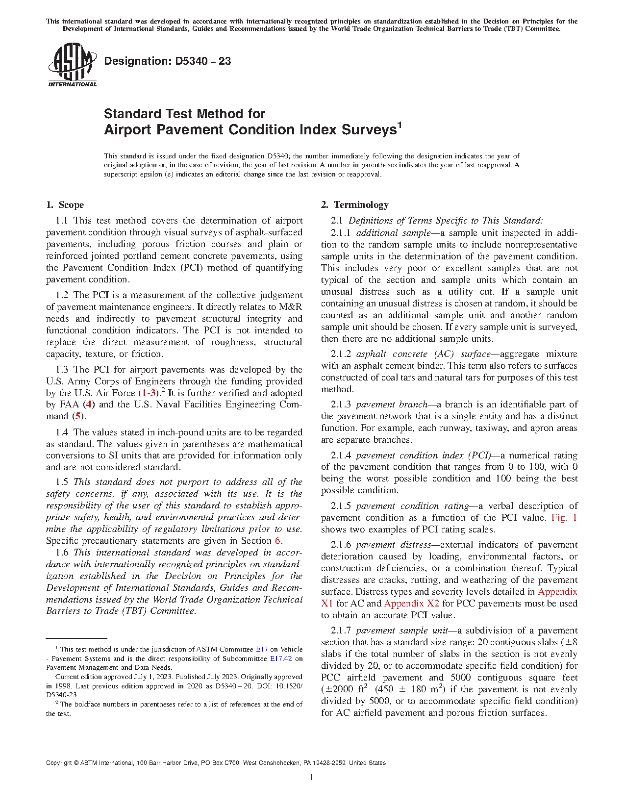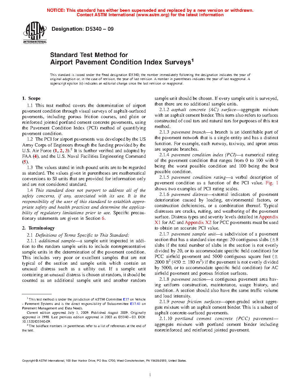 1.1 This test method covers the determination of airport pavement condition through visual surveys of asphalt-surfaced pavements, including porous friction courses, and plain or reinforced jointed portland cement concrete pavements, using the Pavement Condition Index (PCI) method of quantifying pavement condition.