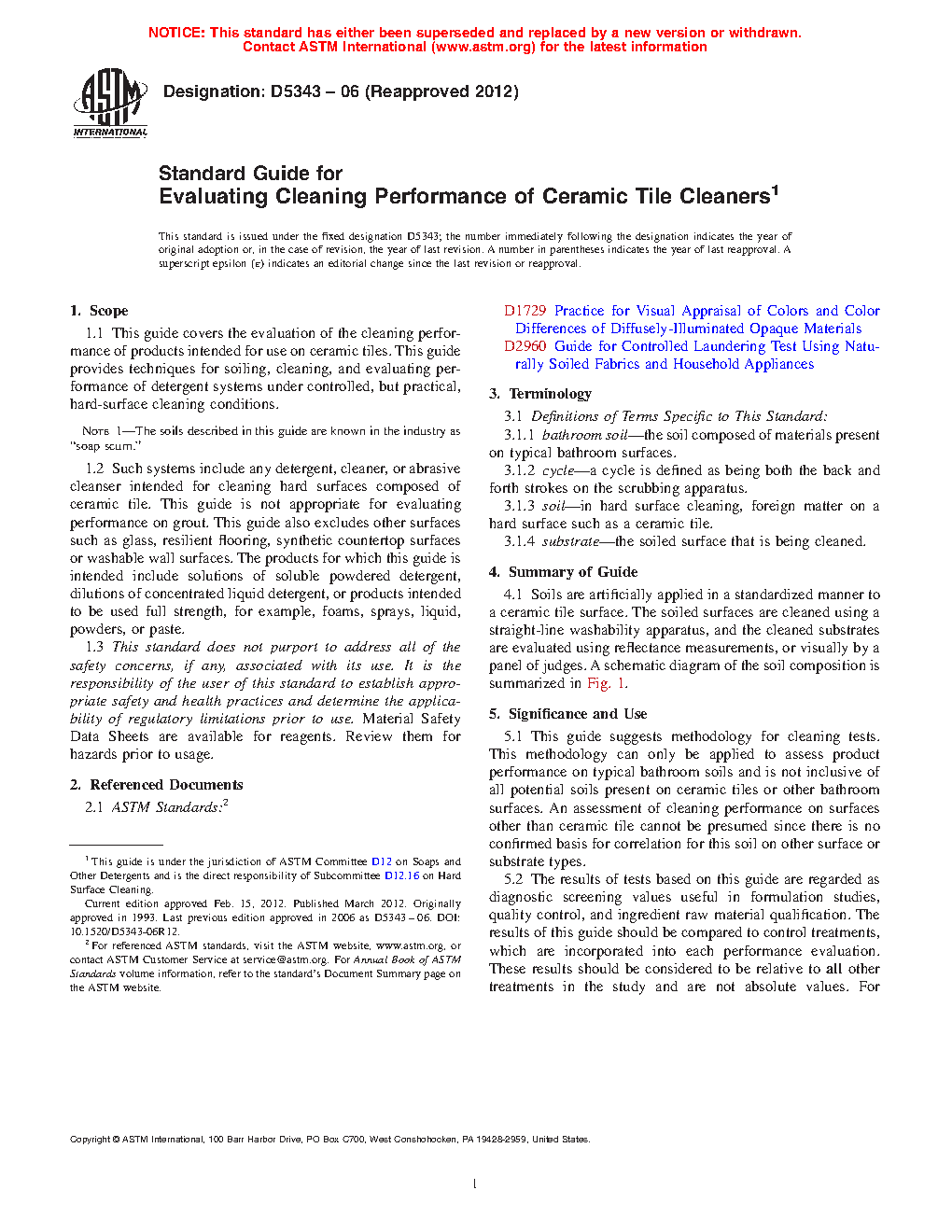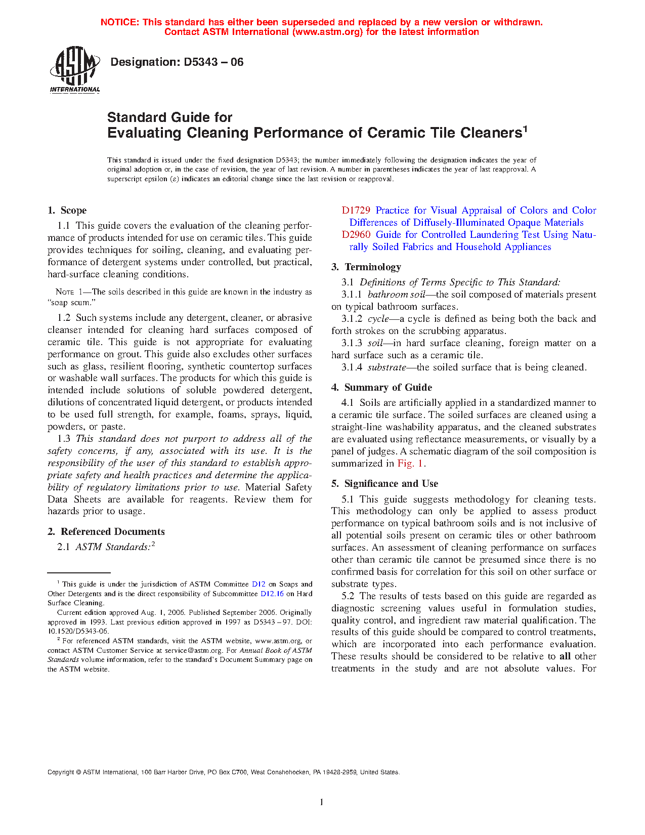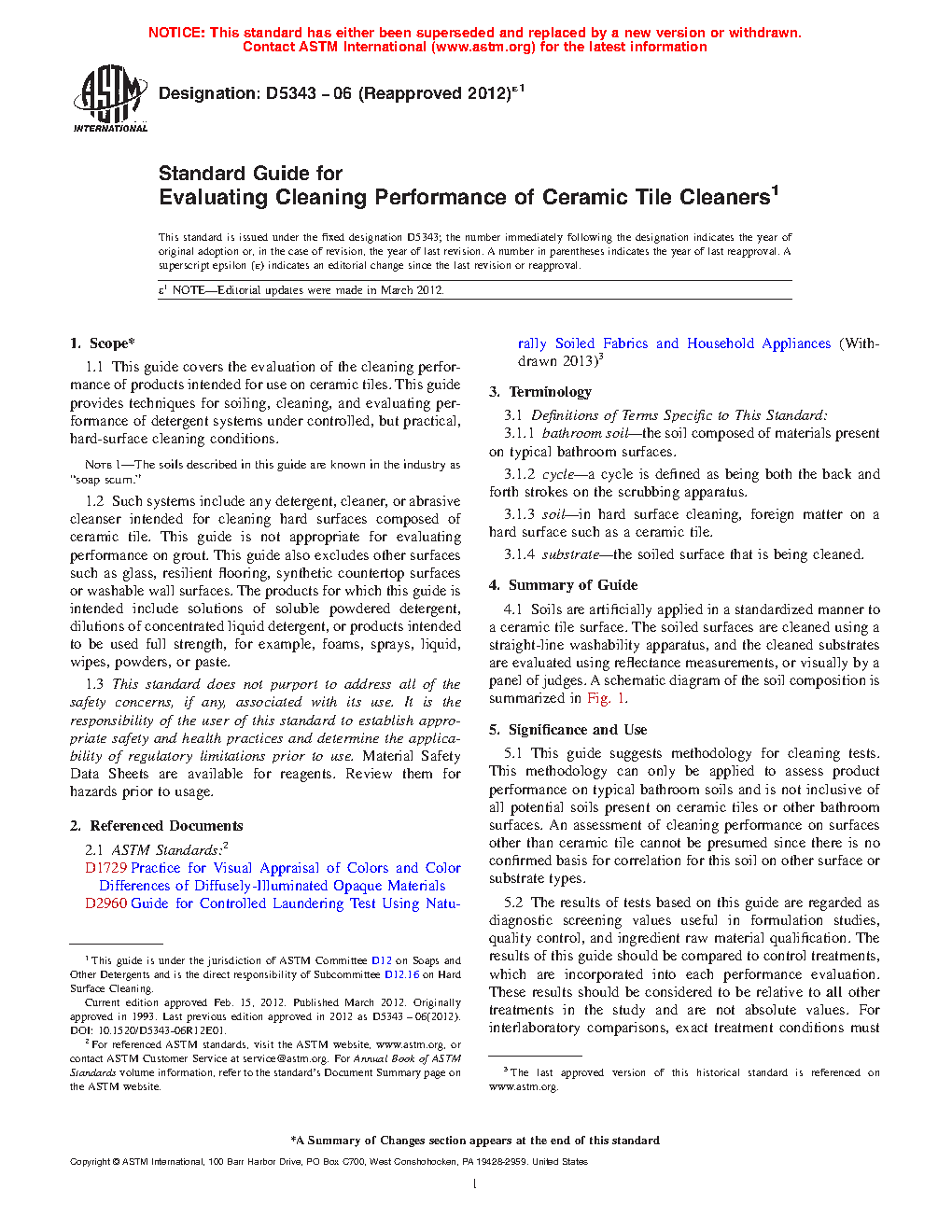 1.1 This guide covers the evaluation of the cleaning performance of products intended for use on ceramic tiles. This guide provides techniques for soiling, cleaning, and evaluating performance of detergent systems under controlled, but practical, hard-surface cleaning conditions.