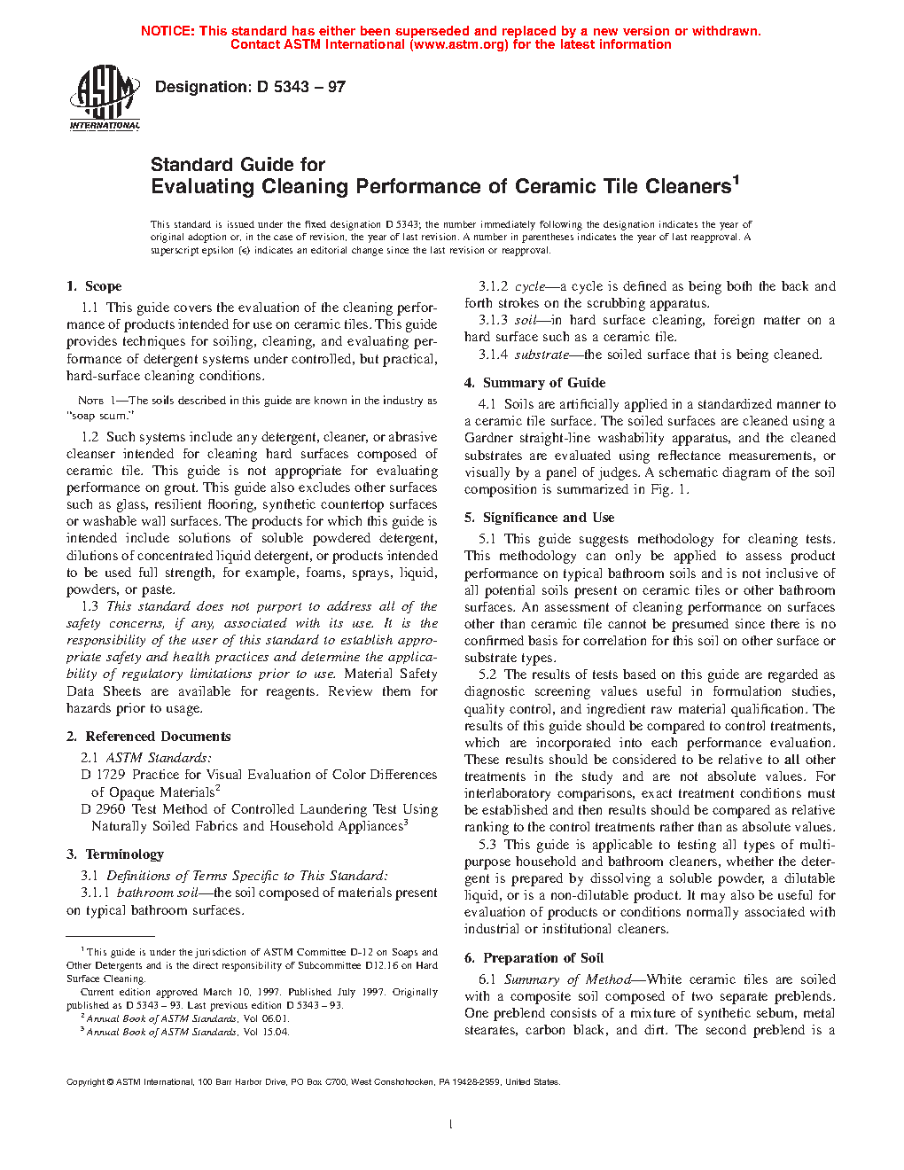5.1 This guide suggests methodology for cleaning tests. This methodology can only be applied to assess product performance on typical bathroom soils and is not inclusive of all potential soils present on ceramic tiles or other bathroom surfaces. An assessment of cleaning performance on surfaces other than ceramic tile cannot be presumed since there is no confirmed basis for correlation for this soil on other surface or substrate types.