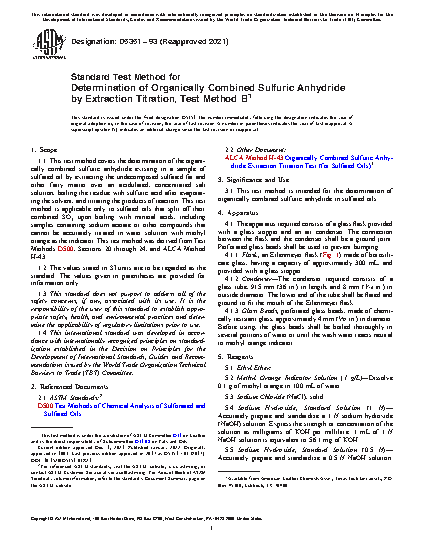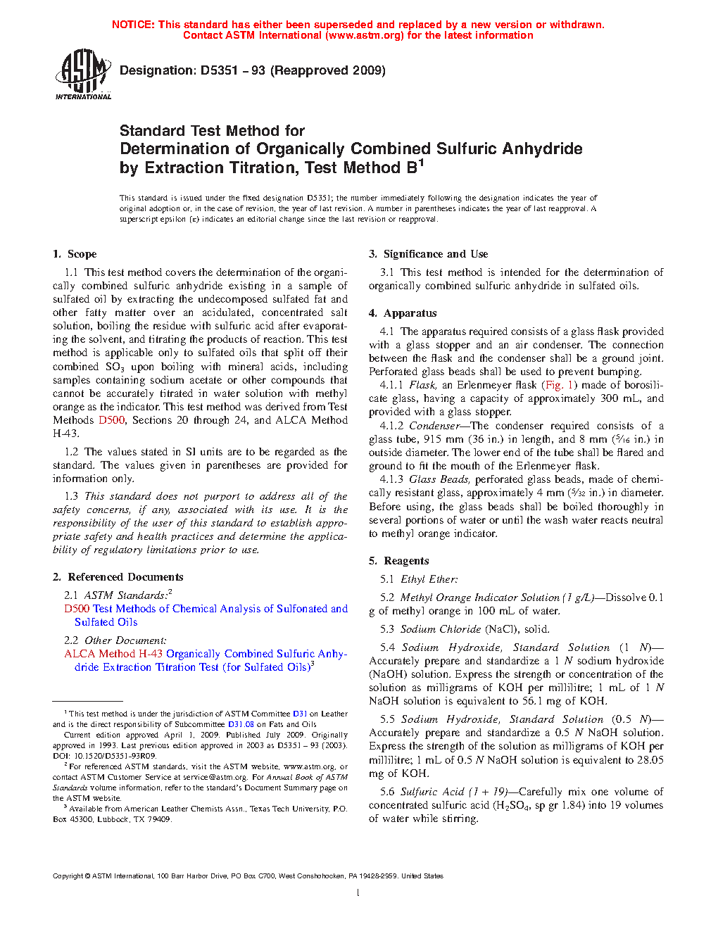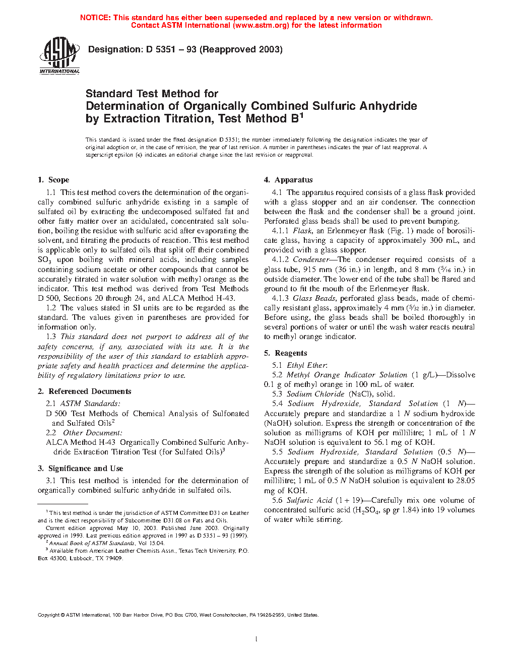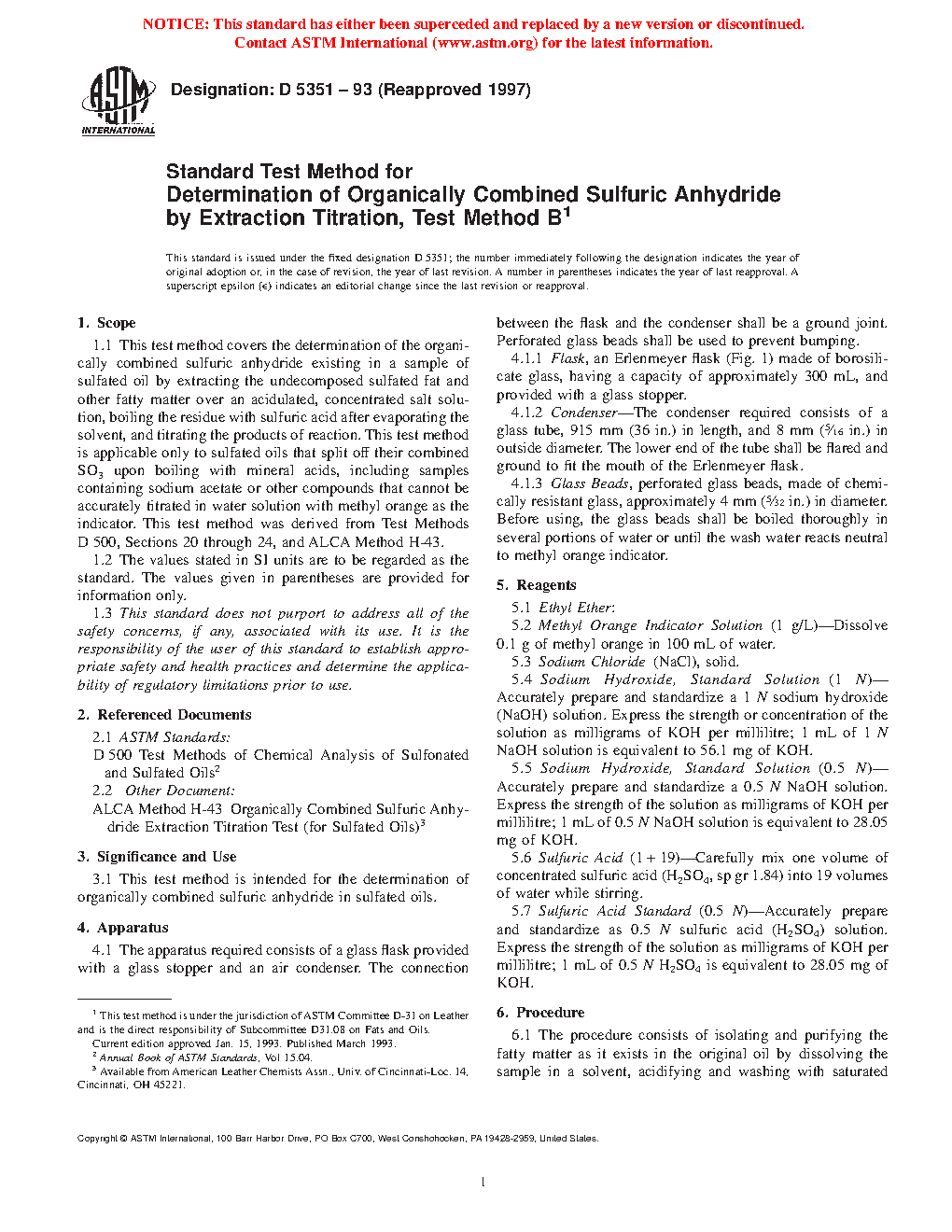 1.1 This test method covers the determination of the organically combined sulfuric anhydride existing in a sample of sulfated oil by extracting the undecomposed sulfated fat and other fatty matter over an acidulated, concentrated salt solution, boiling the residue with sulfuric acid after evaporating the solvent, and titrating the products of reaction. This test method is applicable only to sulfated oils that split off their combined SO3 upon boiling with mineral acids, including samples containing sodium acetate or other compounds that cannot be accurately titrated in water solution with methyl orange as the indicator. This test method was derived from Test Methods D500, Sections 20 through 24, and ALCA Method H-43.