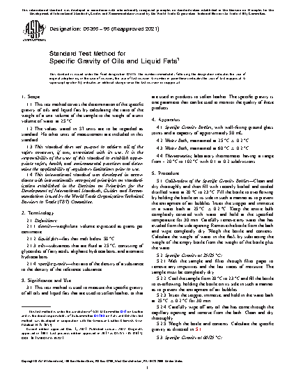 1.1 This test method covers the determination of the specific gravity of oils and liquid fats by calculating the ratio of the weight of a unit volume of the sample to the weight of a unit volume of water at 25°C.