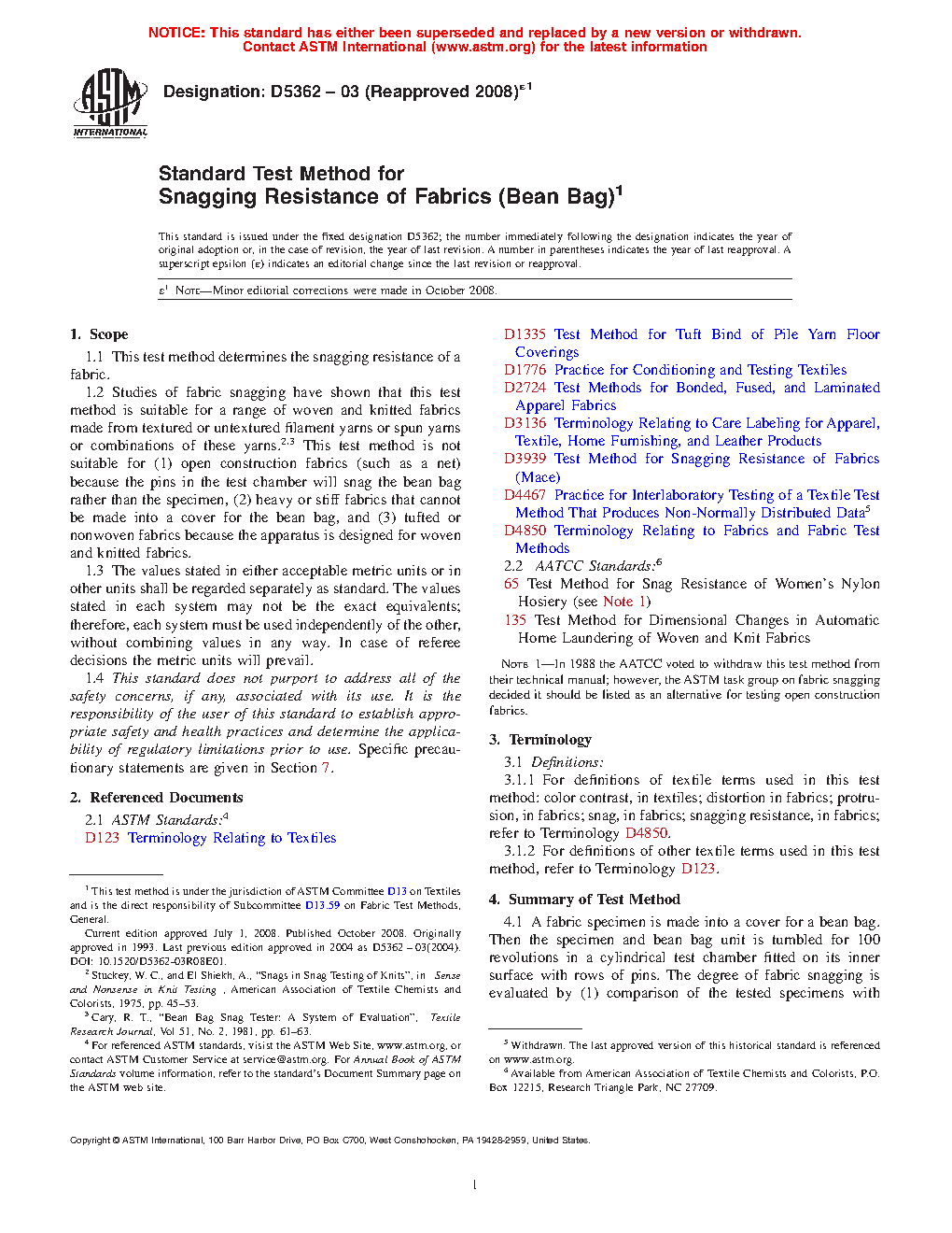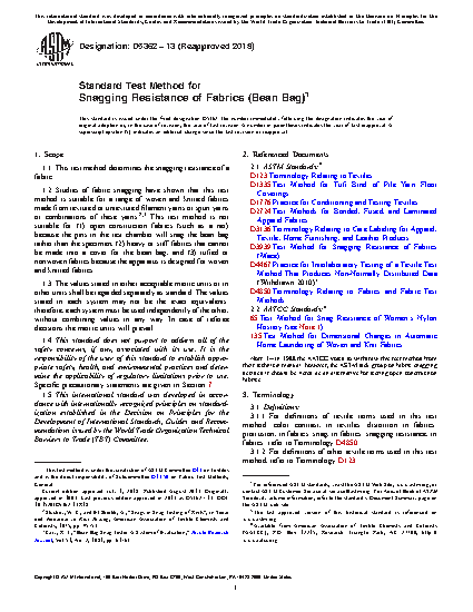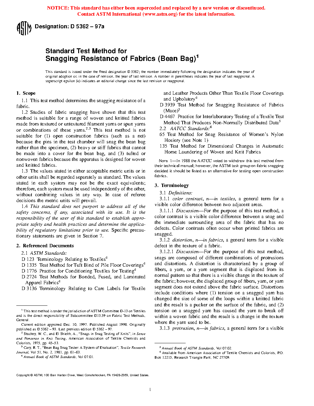 1.2 Studies of fabric snagging have shown that this test method is suitable for a range of woven and knitted fabrics made from textured or untextured filament yarns or spun yarns or combinations of these yarns.2 ,3 This test method is not suitable for (1) open construction fabrics (such as a net) because the pins in the test chamber will snag the bean bag rather than the specimen, (2) heavy or stiff fabrics that cannot be made into a cover for the bean bag, and (3) tufted or nonwoven fabrics because the apparatus is designed for woven and knitted fabrics.