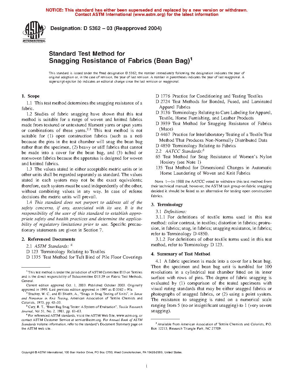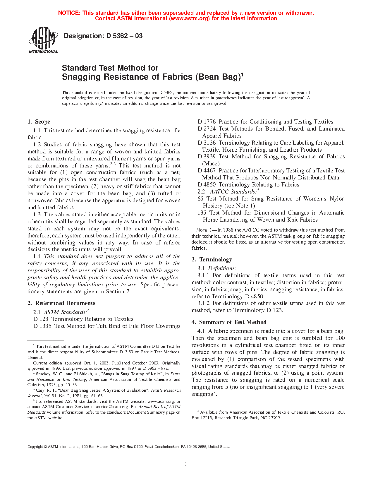 5.5 The snagging resistance of a specific fabric varies with individual wearers and general conditions of use. Therefore, it can be expected that garments of the same fabric will show a fairly wide snagging resistance spectrum after wear and much greater variation in wear than in replicate fabric specimens subjected to controlled laboratory tests. This factor should be considered when adopting levels of acceptability for any specification that includes snagging resistance.