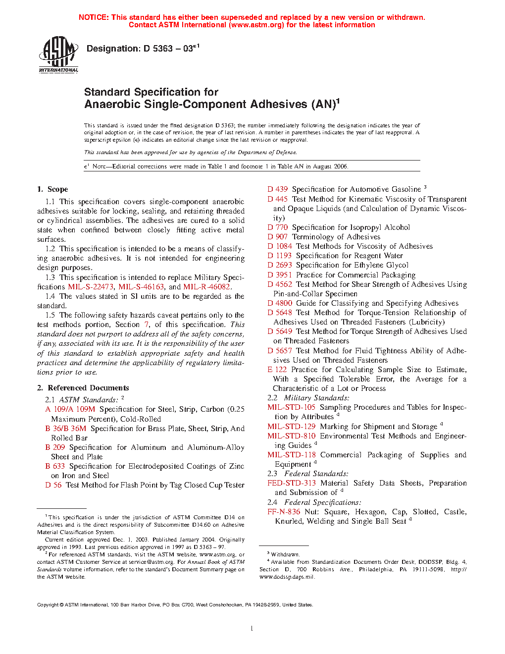 1.1 This specification covers single-component anaerobic adhesives suitable for locking, sealing, and retaining threaded or cylindrical assemblies. The adhesives are cured to a solid state when confined between closely fitting active metal surfaces.