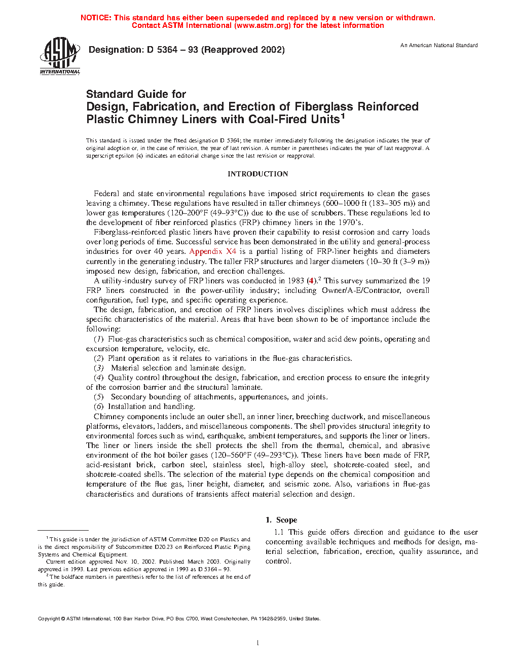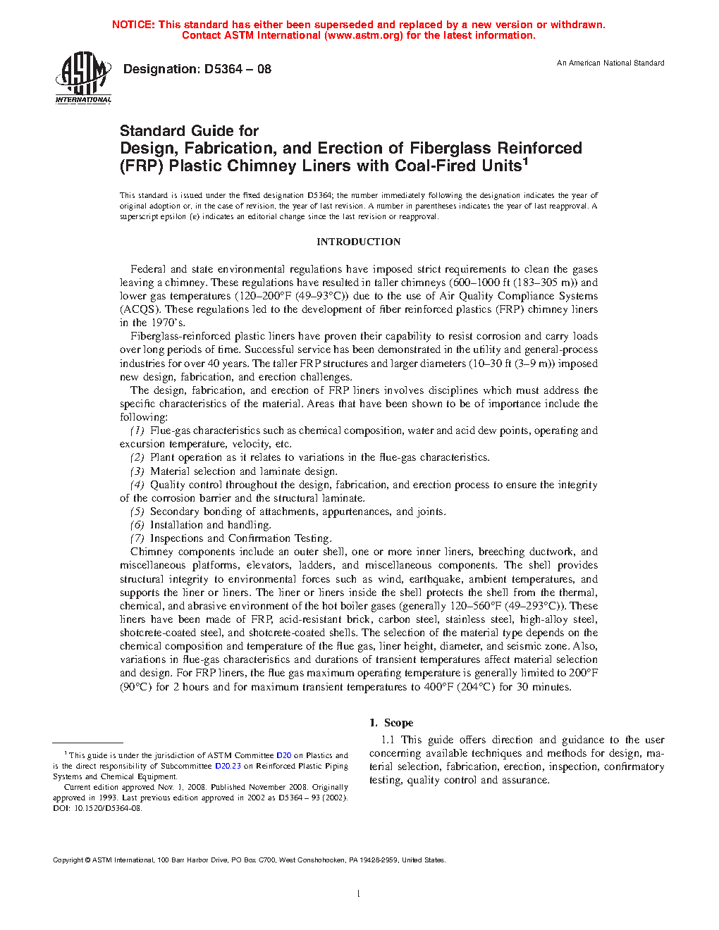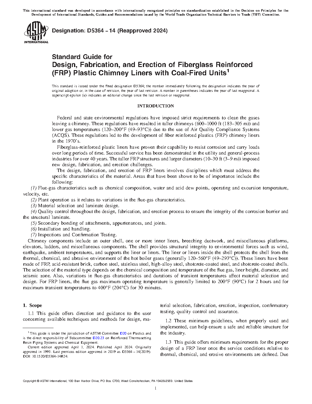 This guide provides uniformity and consistency to the design, fabrication, and erection of fiberglass-reinforced plastic (FRP) liners for concrete chimneys with coal-fired units. Other fossil fuels will require a thorough review of the operating and service conditions and the impact on material selection.