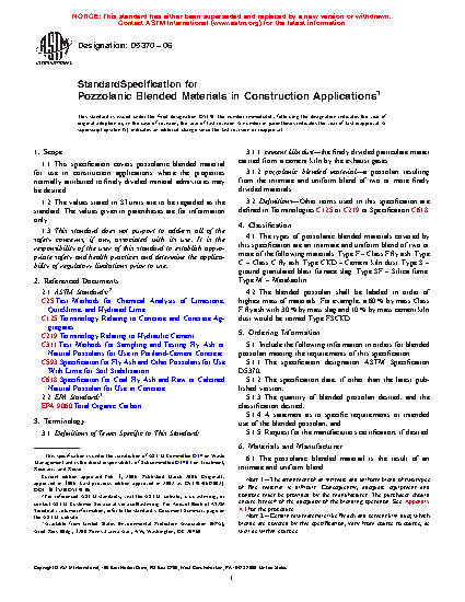 This specification covers Pozzolanic blended material for use in construction applications where the properties similar to finely divided mineral admixtures is present. The types of Pozzolanic blended materials covered by this specification are an intimate and uniform blend of two or more of the following materials: Type F - Class F fly ash; Type C - Class C fly ash; Type CKD - Cement kiln dust; Type S - ground granulated blast furnace slag; Type SF - Silica fume; Type M - Metakaolin. Materials shall be tested and the individual grades shall conform to specified requirements of blended Pozzolan for use with lime, and blended Pozzolan for use in concrete, detailed in this specification.