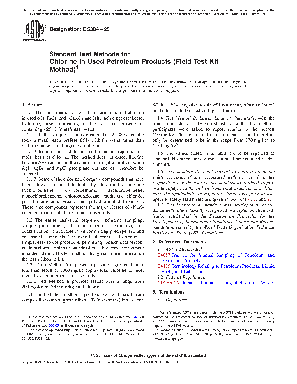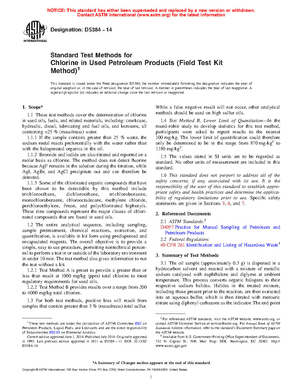 Note 1: Federal Regulations mandate that often the chlorine content of used oil must be determined before recycling. EPA regulation 40 CFR 261 bars the sale of used oil for fuel if it is contaminated with halogens measured as chlorine at levels exceeding 1000 mg/kg. Such oil is considered to be a hazardous waste unless it can be proven that the chlorine content is inorganic or that the halogenated organics are not hazardous constituents. The cost of disposing of a hazardous waste is many times higher than the cost of used oil disposal. Therefore it is critical for users, generators, haulers, reprocessors, and collectors to test the material they handle in order to comply with regulations, maintain safe operations, and avoid high disposal costs.