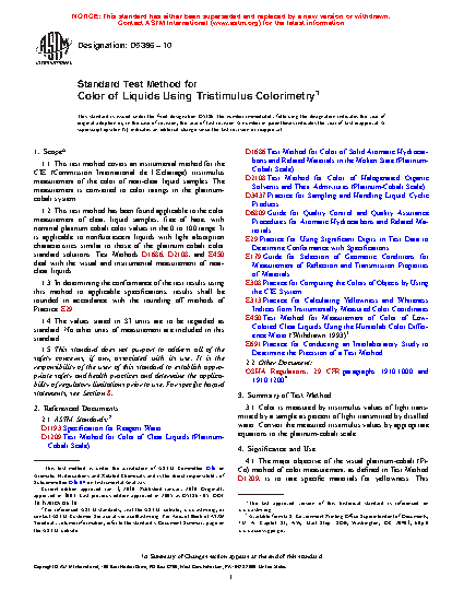 1.1 This test method covers an instrumental method for the CIE (Commission International de l’Eclairage) tristimulus measurement of the color of near-clear liquid samples. The transmission measurement values are converted to the color scale in the platinum-cobalt (Pt-Co) system.