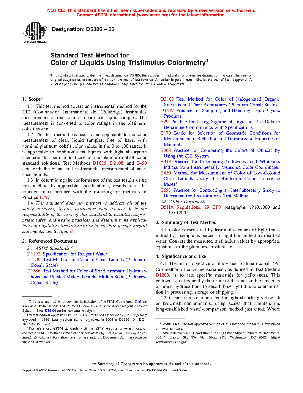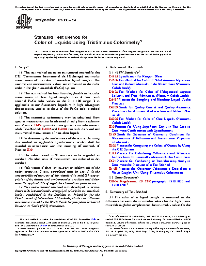 1.3 The tristimulus colorimetry may be calculated from spectral measurements or be obtained directly from a colorimeter. Practice E1455 provides some guidance on colorimeters, while Test Methods D1686 and D2108 deal with the visual and instrumental measurement of near-clear liquids.