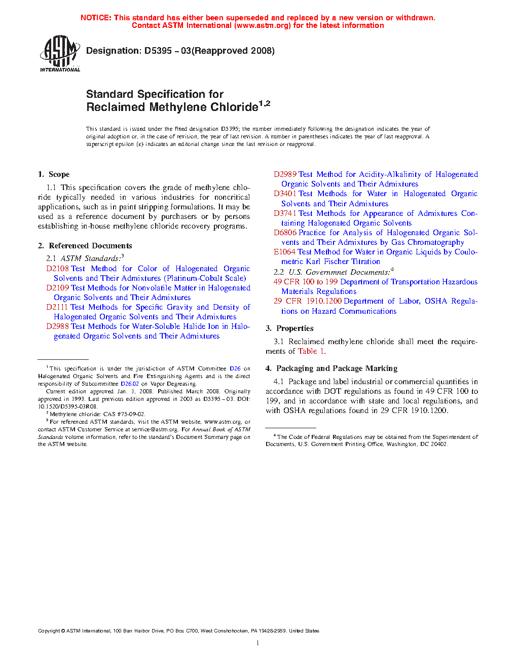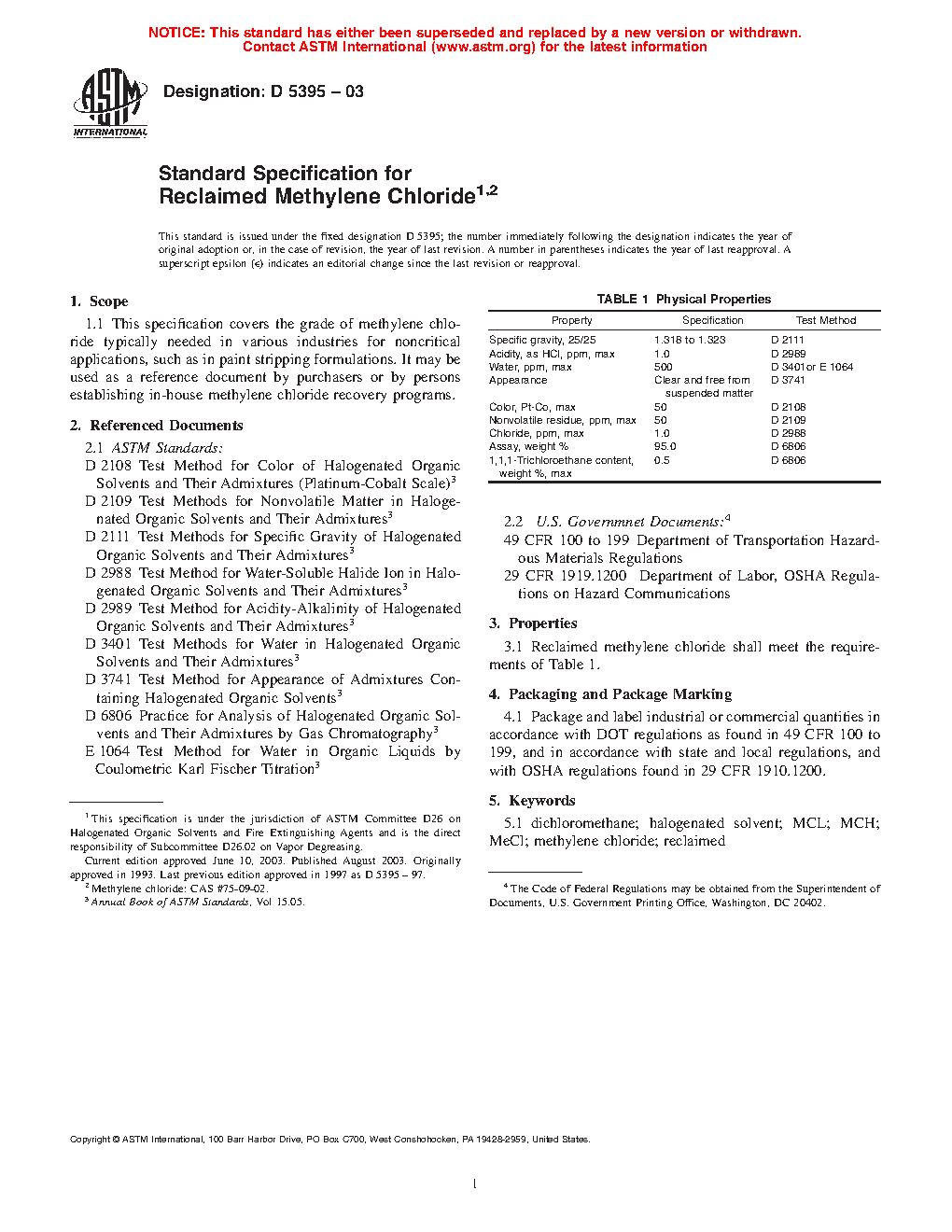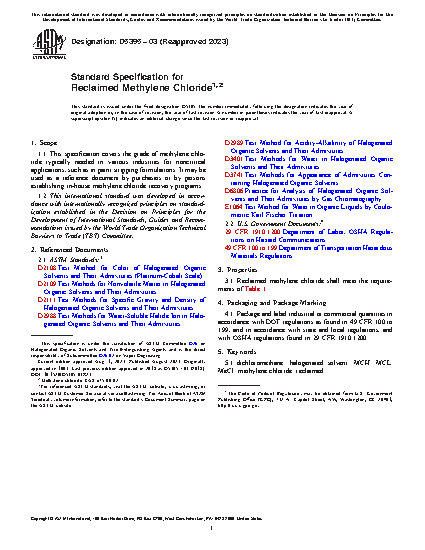 This specification covers reclaimed methylene chloride used in various industries for noncritical applications. Tests for specific gravity, acidity, water content, appearance, color, nonvolatile residue, chloride content, assay, and 1,1,1-trichloroethane content shall be performed and shall conform to the requirements specified.