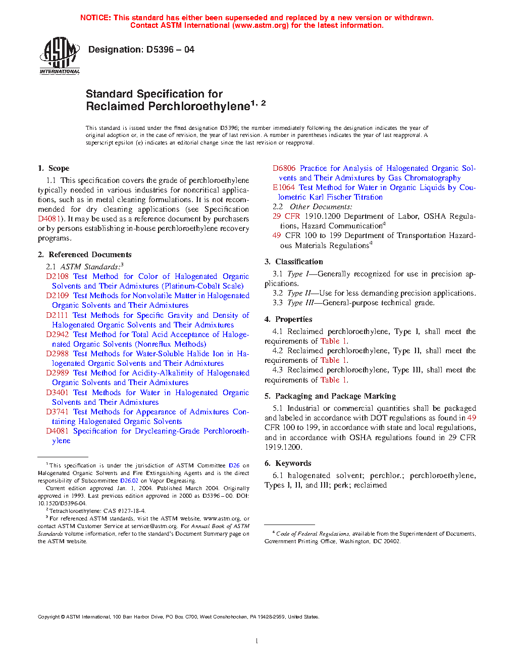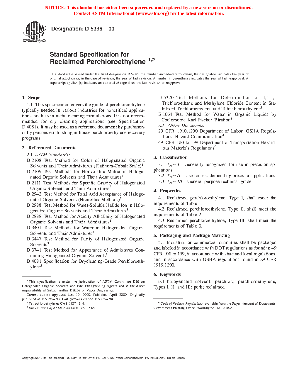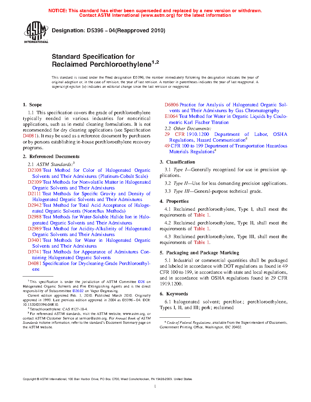 This specification establishes the requirements for reclaimed perchloroethylene typically needed in various industries for noncritical applications such as in metal cleaning formulations. This is not recommended for dry cleaning applications, but may be used as a reference document by purchasers or by persons establishing in-house perchloroethylene recovery programs. Covered here are the following types: Type I, generally recognized for use in precision applications; Type II, used for less demanding precision applications; and Type III, general purpose technical grade. Specimens shall be tested and each type should conform individually to the following properties: specific gravity; maximum compositions for chlorides, nonvolatile residue, water, and 1,1,1-trichloroethane; assay weight; color (Pt-Co scale); appearance; acid acceptance (as NaOH); and acidity (as HCl).