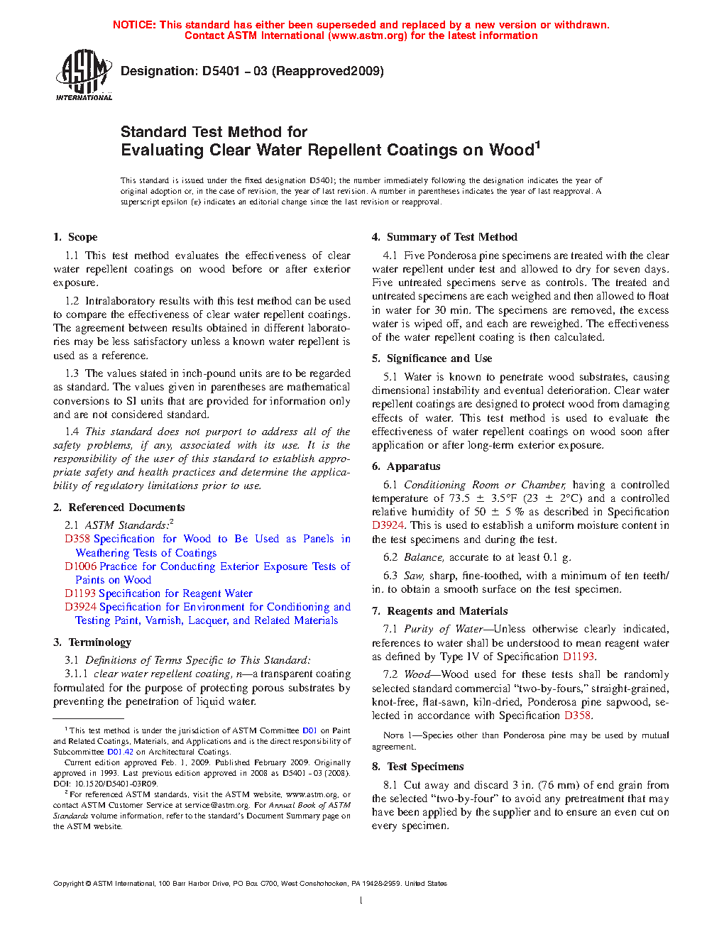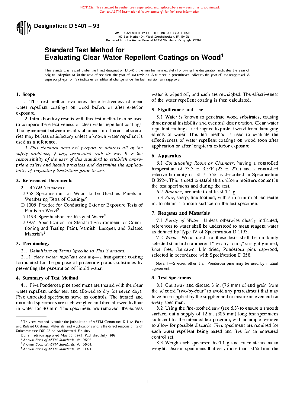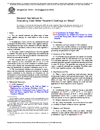Water is known to penetrate wood substrates, causing dimensional instability and eventual deterioration. Clear water repellent coatings are designed to protect wood from damaging effects of water. This test method is used to evaluate the effectiveness of water repellent coatings on wood soon after application or after long-term exterior exposure.