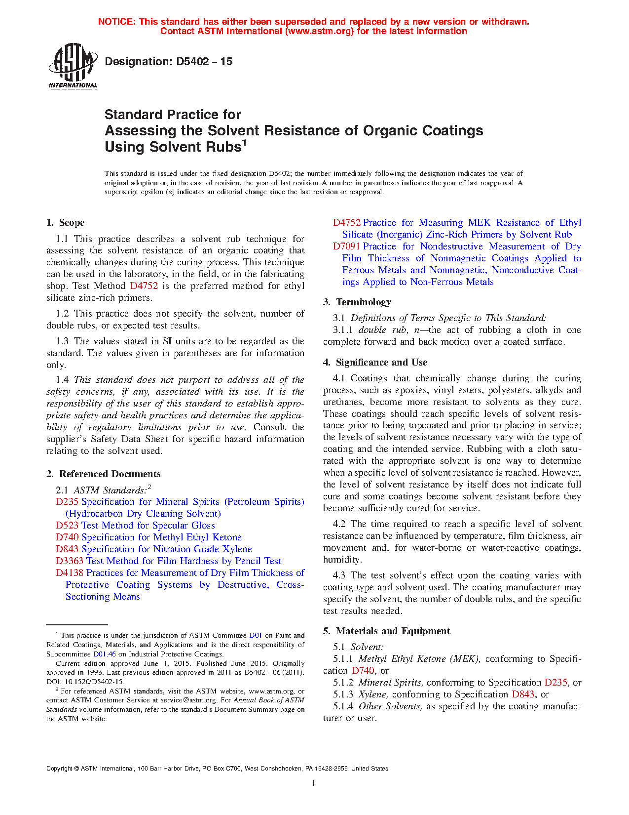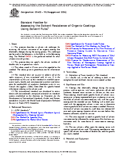 1.1 This practice describes a solvent rub technique for assessing the solvent resistance of an organic coating that chemically changes during the curing process. This technique can be used in the laboratory, in the field, or in the fabricating shop. Test Method D4752 is the preferred method for ethyl silicate zinc-rich primers.