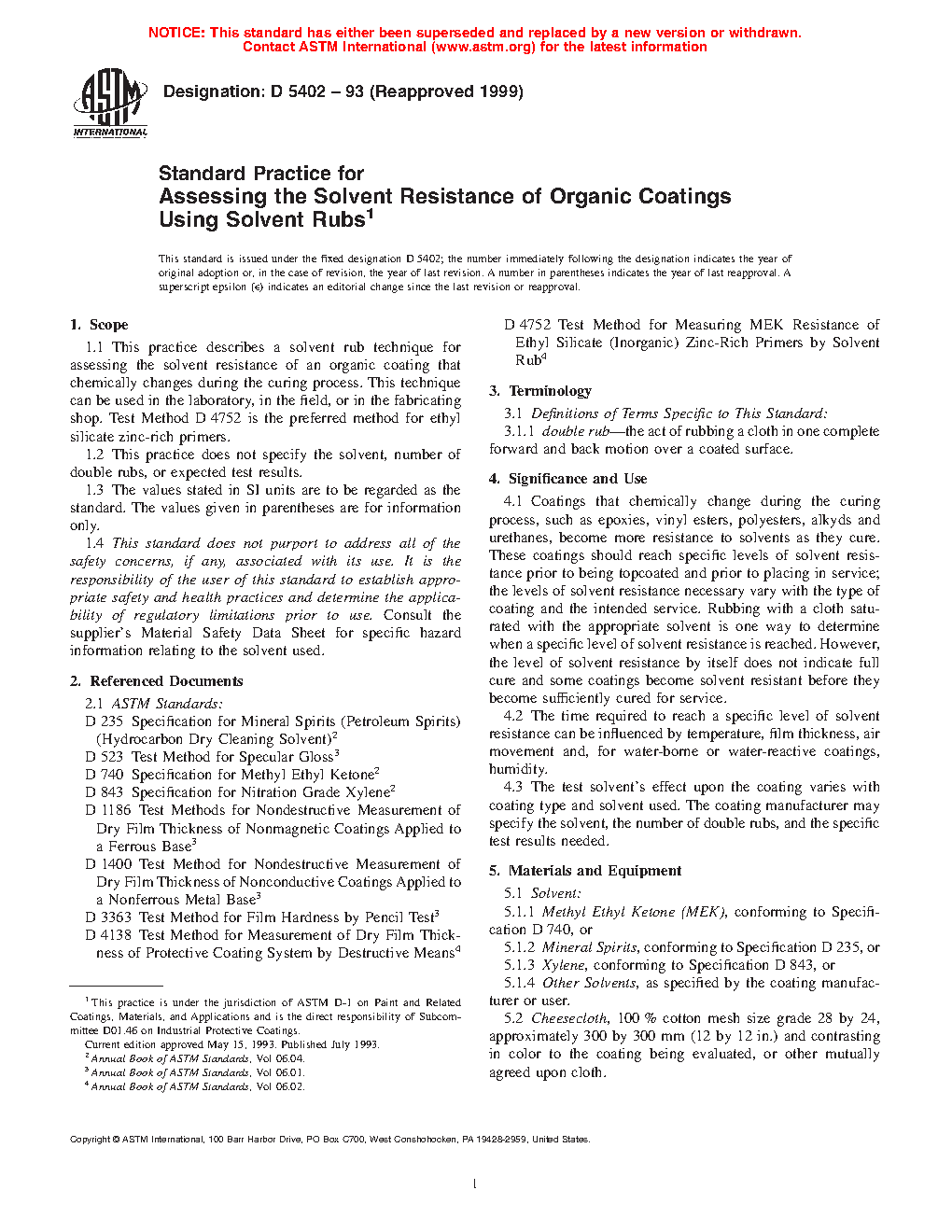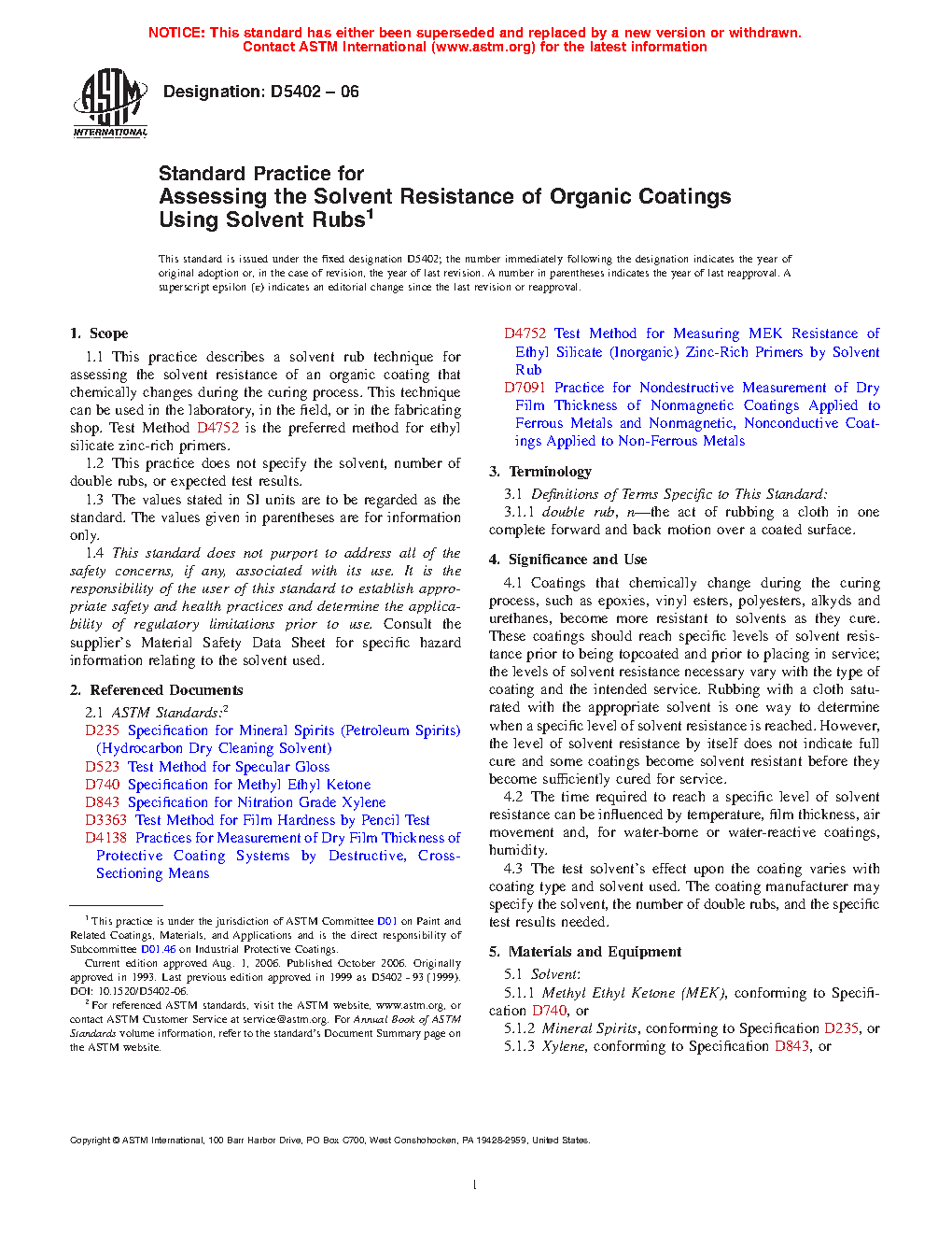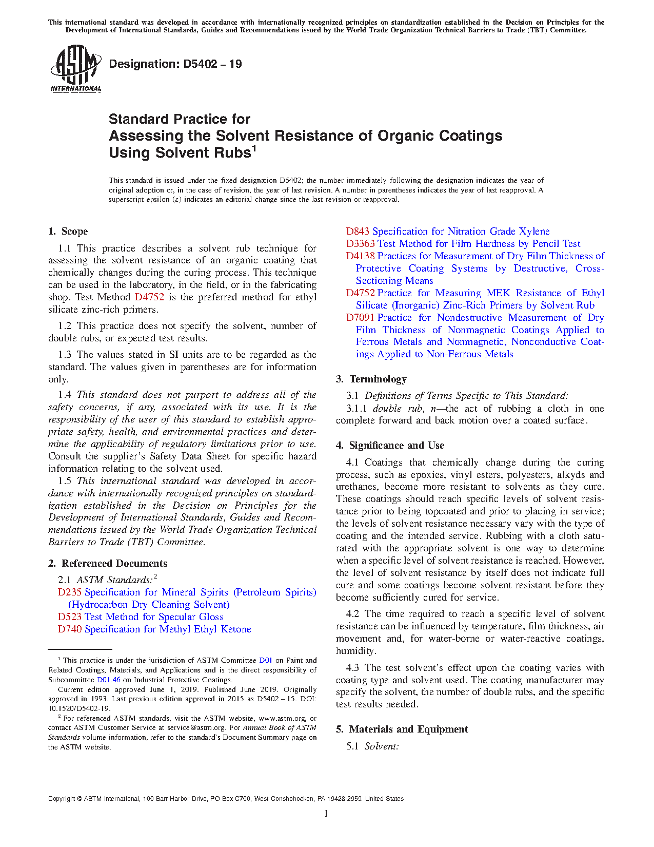 4.3 The test solvent’s effect upon the coating varies with coating type and solvent used. The coating manufacturer may specify the solvent, the number of double rubs, and the specific test results needed.