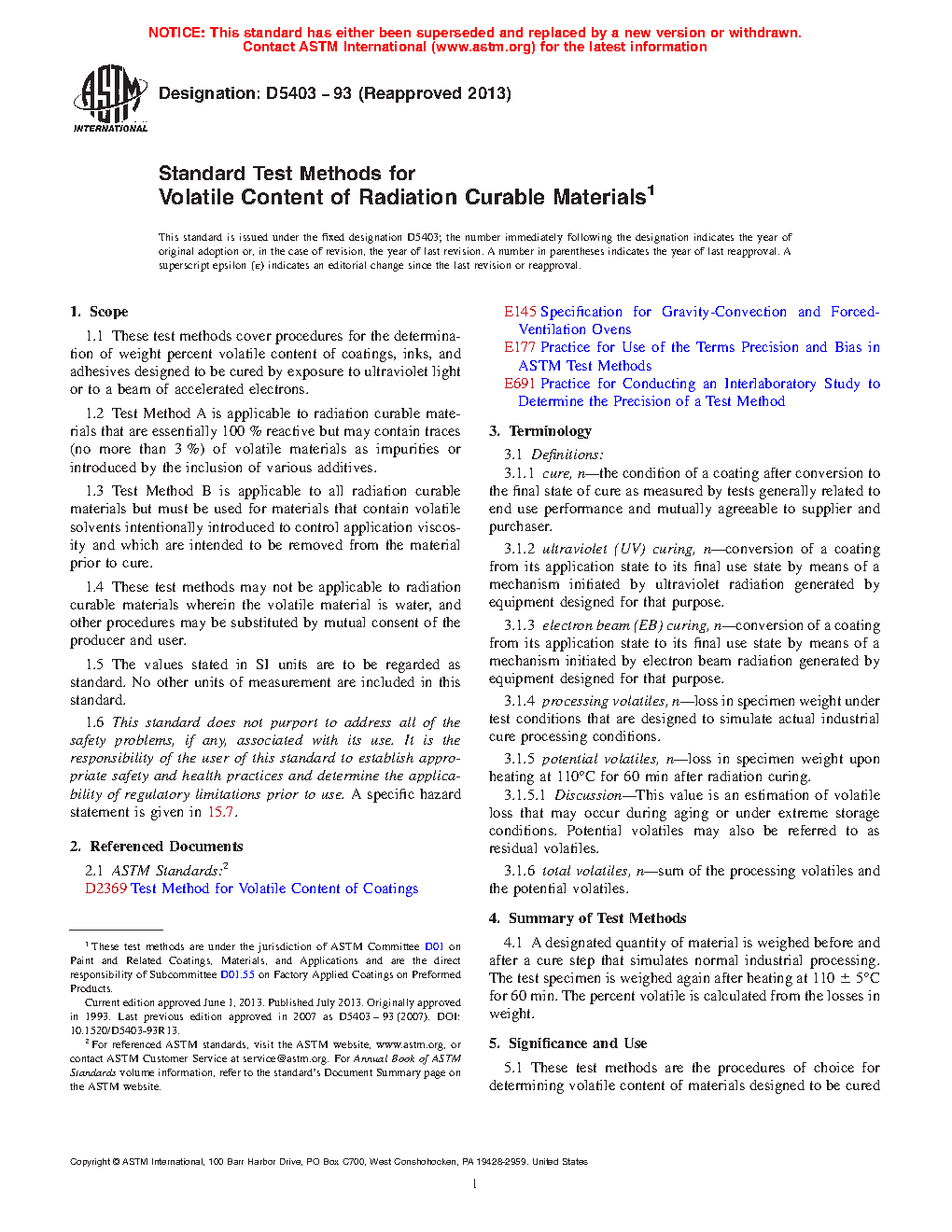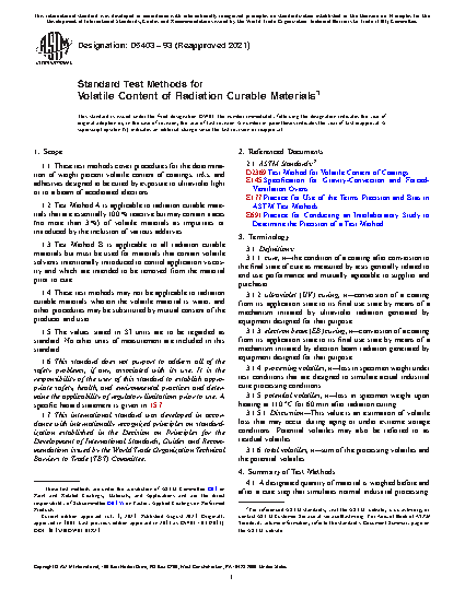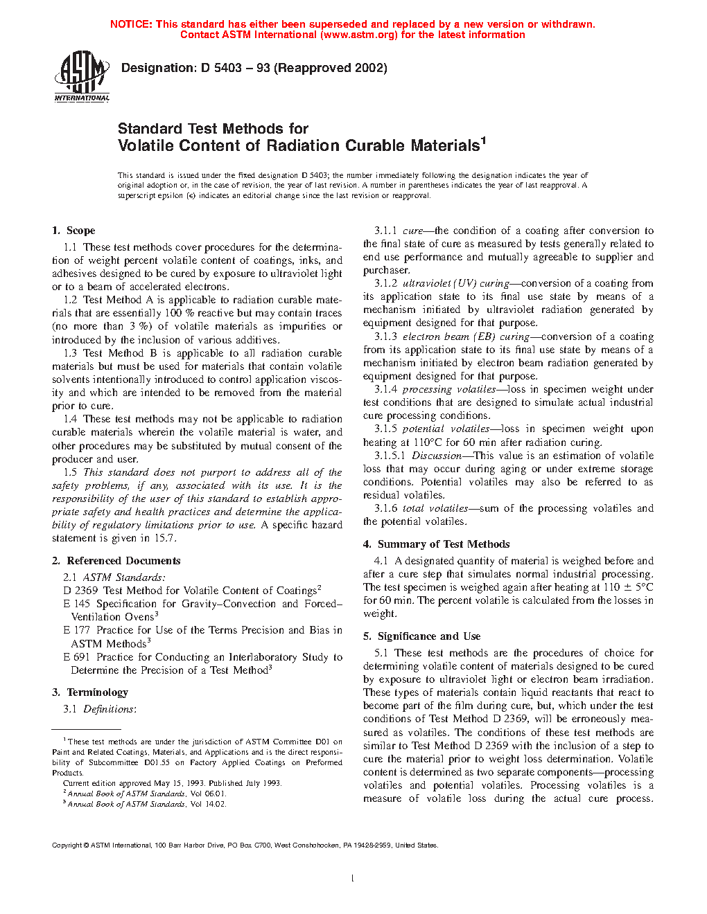 1.1 These test methods cover procedures for the determination of weight percent volatile content of coatings, inks, and adhesives designed to be cured by exposure to ultraviolet light or to a beam of accelerated electrons.