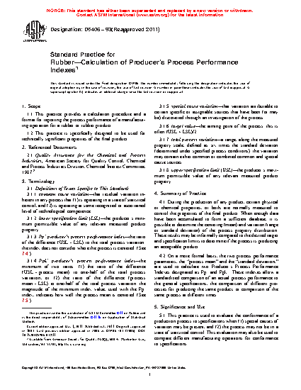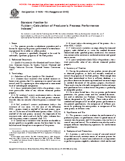 1.1 This practice provides a calculation procedure and a format for reporting the process performance of a manufacturing operation for a rubber or rubber product.