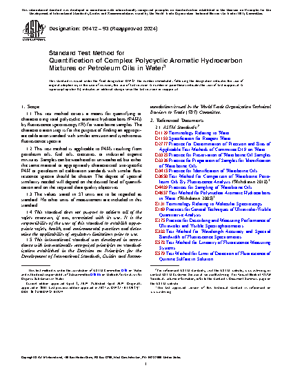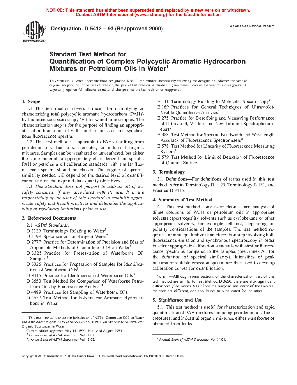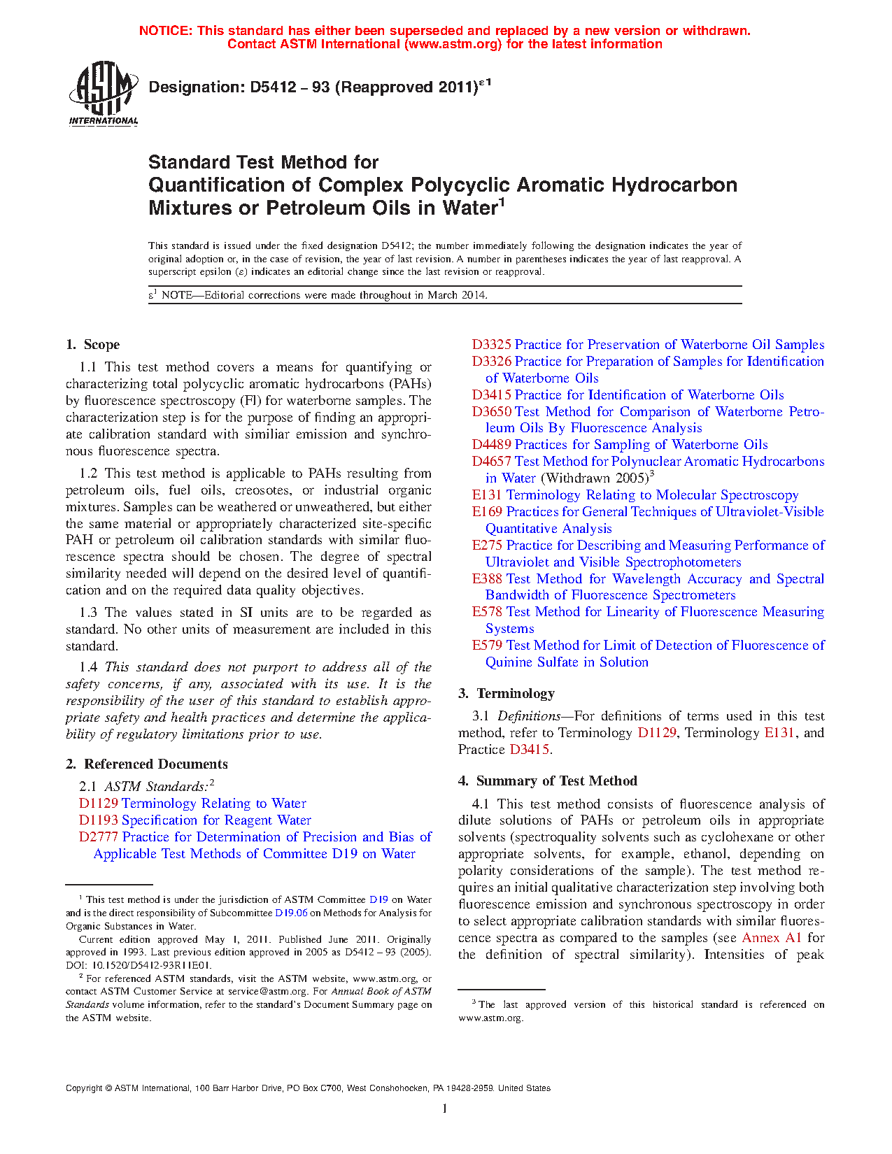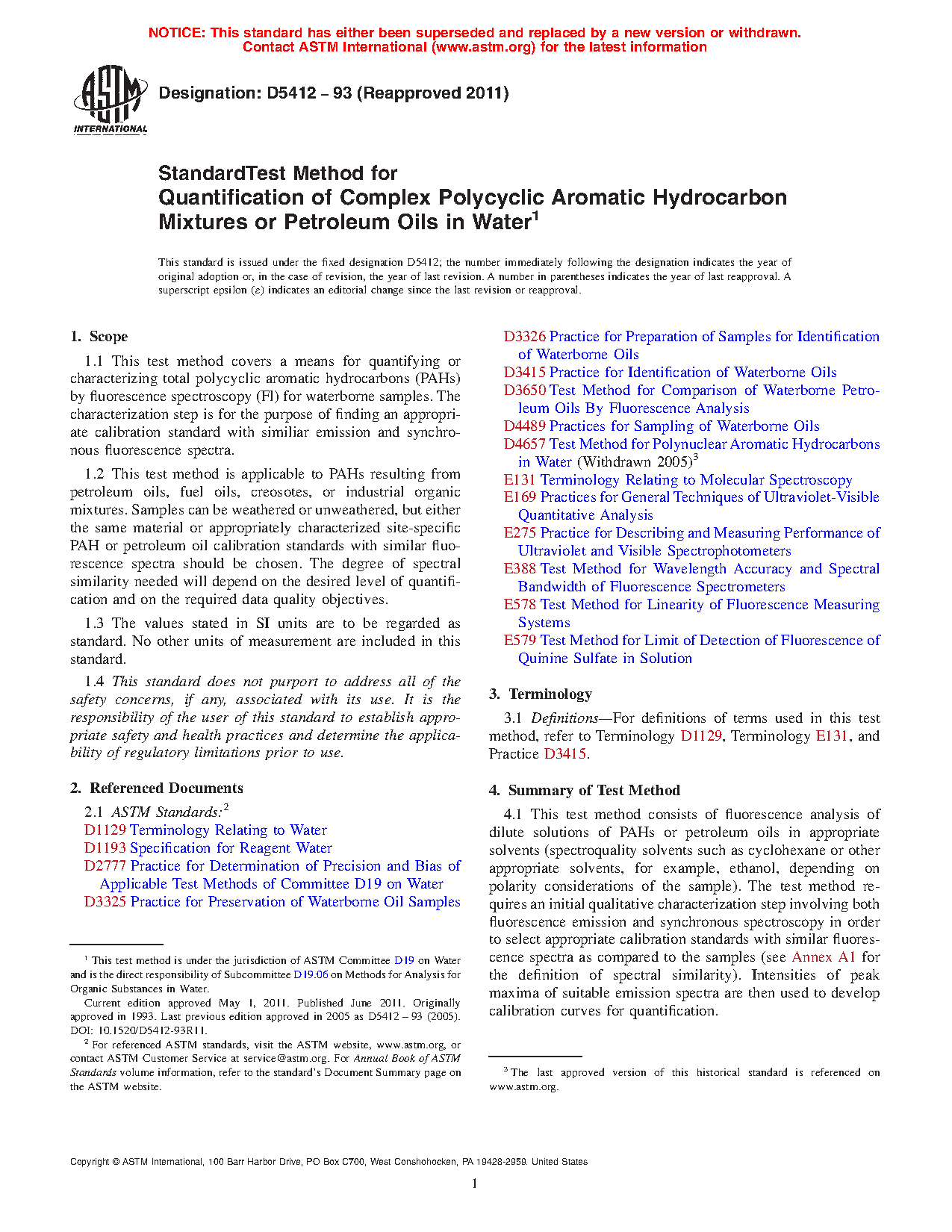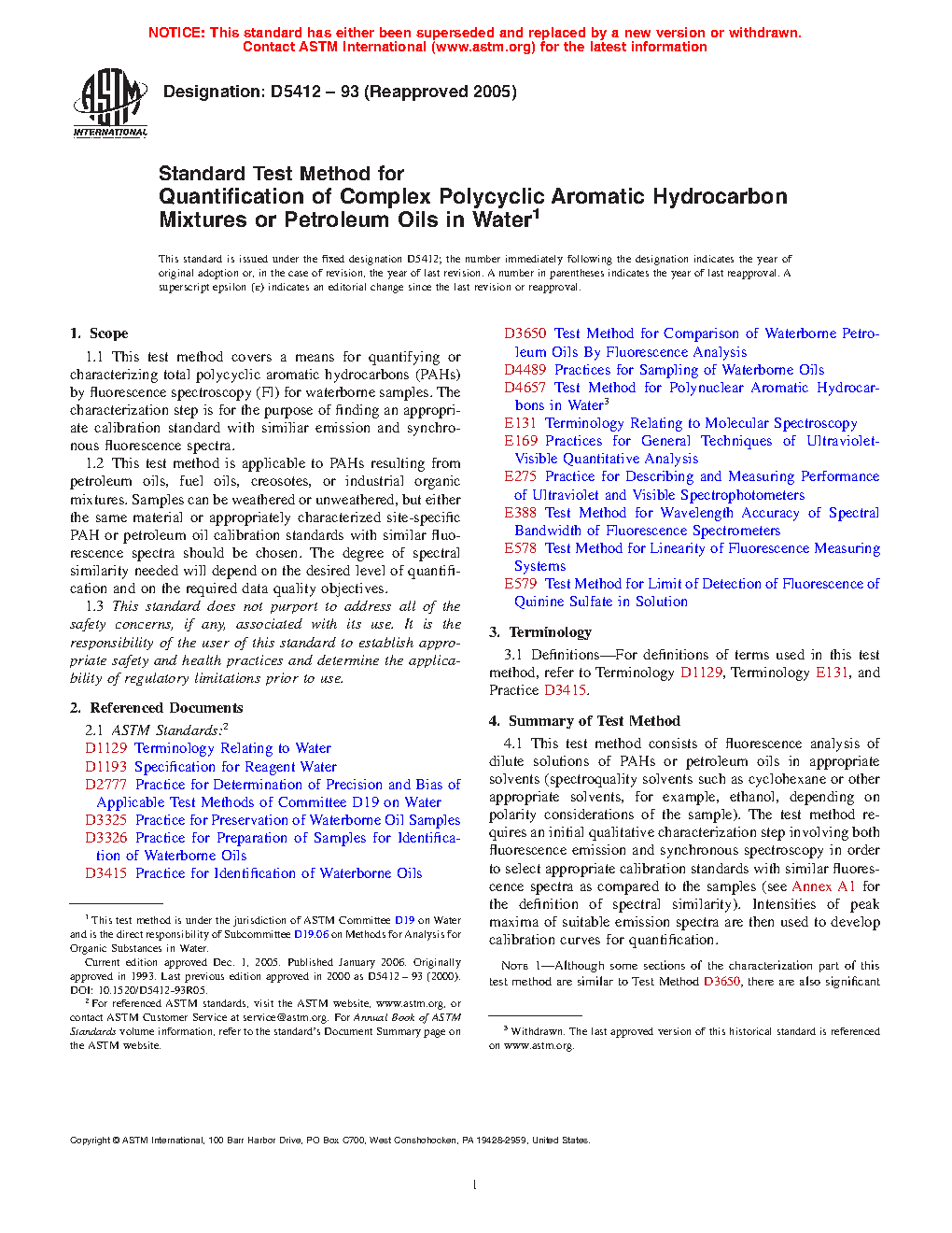 1.2 This test method is applicable to PAHs resulting from petroleum oils, fuel oils, creosotes, or industrial organic mixtures. Samples can be weathered or unweathered, but either the same material or appropriately characterized site-specific PAH or petroleum oil calibration standards with similar fluorescence spectra should be chosen. The degree of spectral similarity needed will depend on the desired level of quantification and on the required data quality objectives.