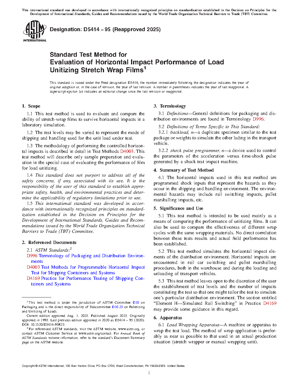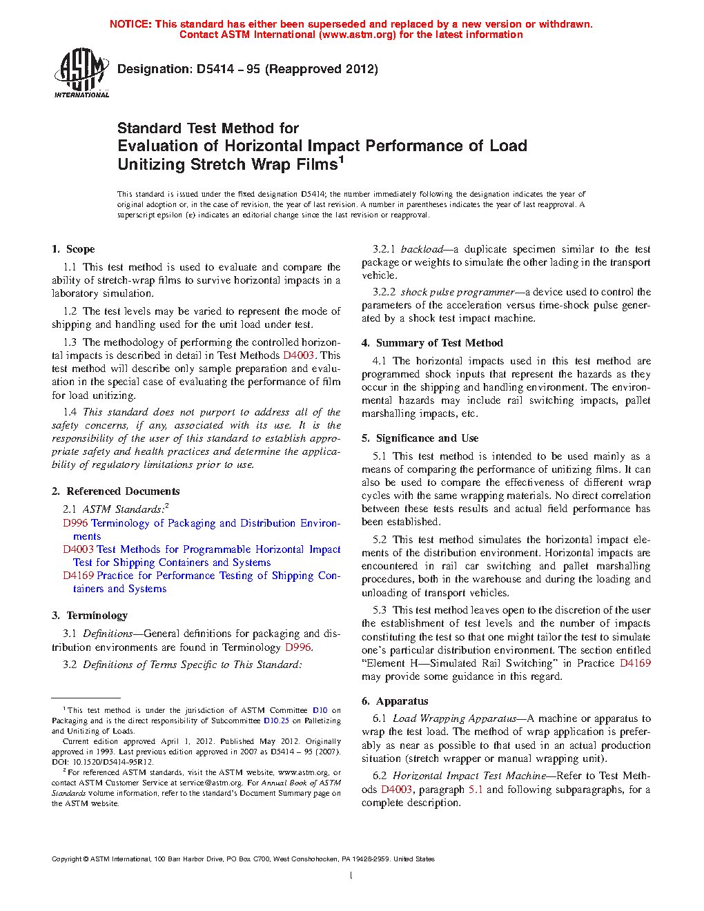 1.3 The methodology of performing the controlled horizontal impacts is described in detail in Test Methods D4003. This test method will describe only sample preparation and evaluation in the special case of evaluating the performance of film for load unitizing.
