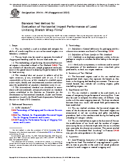 1.1 This test method is used to evaluate and compare the ability of stretch-wrap films to survive horizontal impacts in a laboratory simulation.